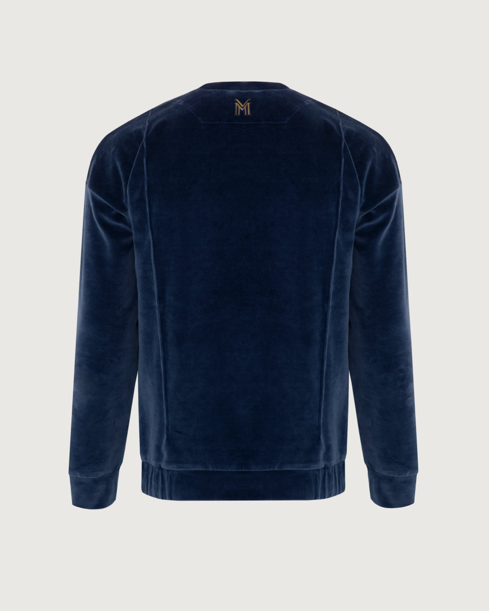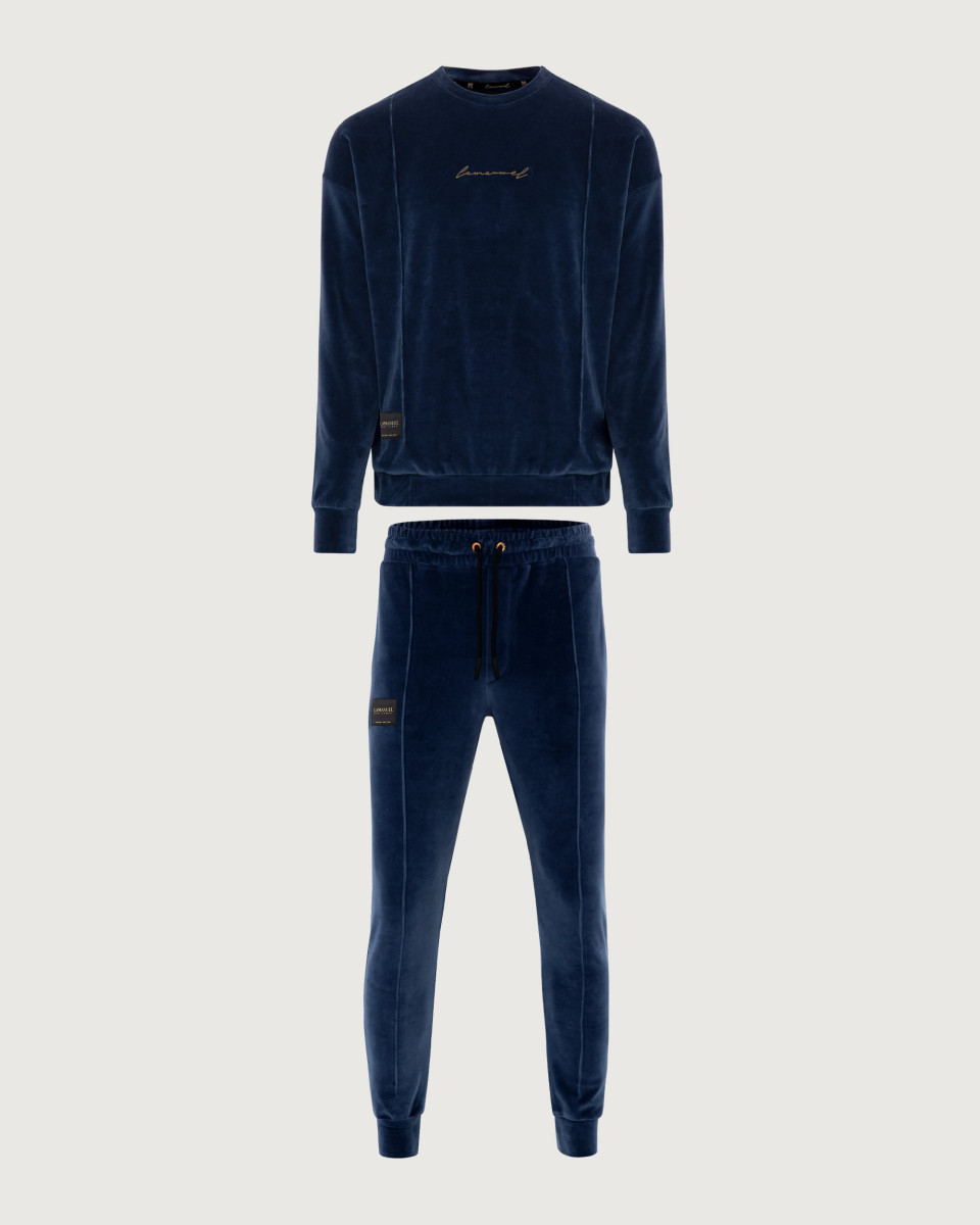 Oversizowy aksamitny komplet męski w którego skład wchodzi bluza i  regulowane w pasie spodnie. Nietypowa luźna forma z ciekawymi przeszyciami oraz najwyższej jakości złoty haft z logo marki na środku i niebanalne detale w postaci wszywek żakardowych i małego logotypu na plecach pozwolą poczuć się swobodnie a zarazem luksusowo.