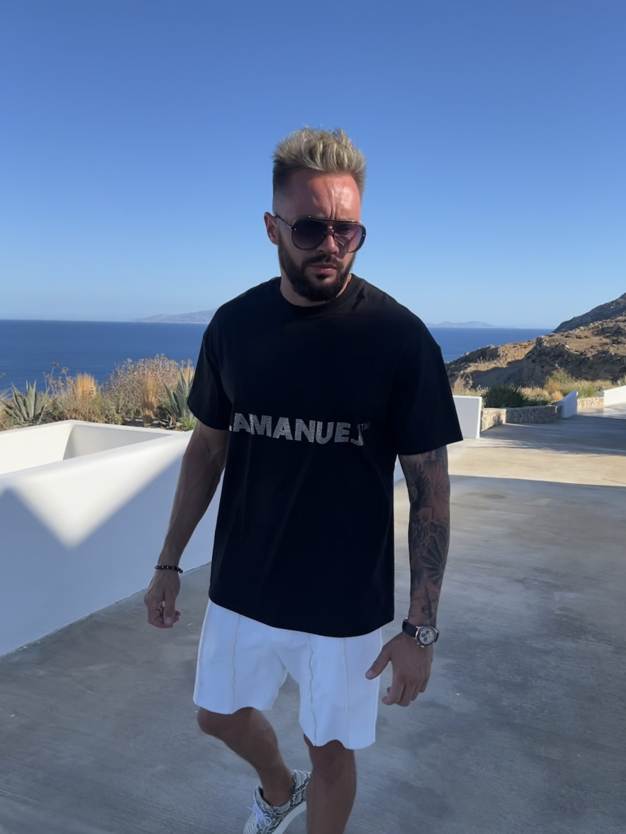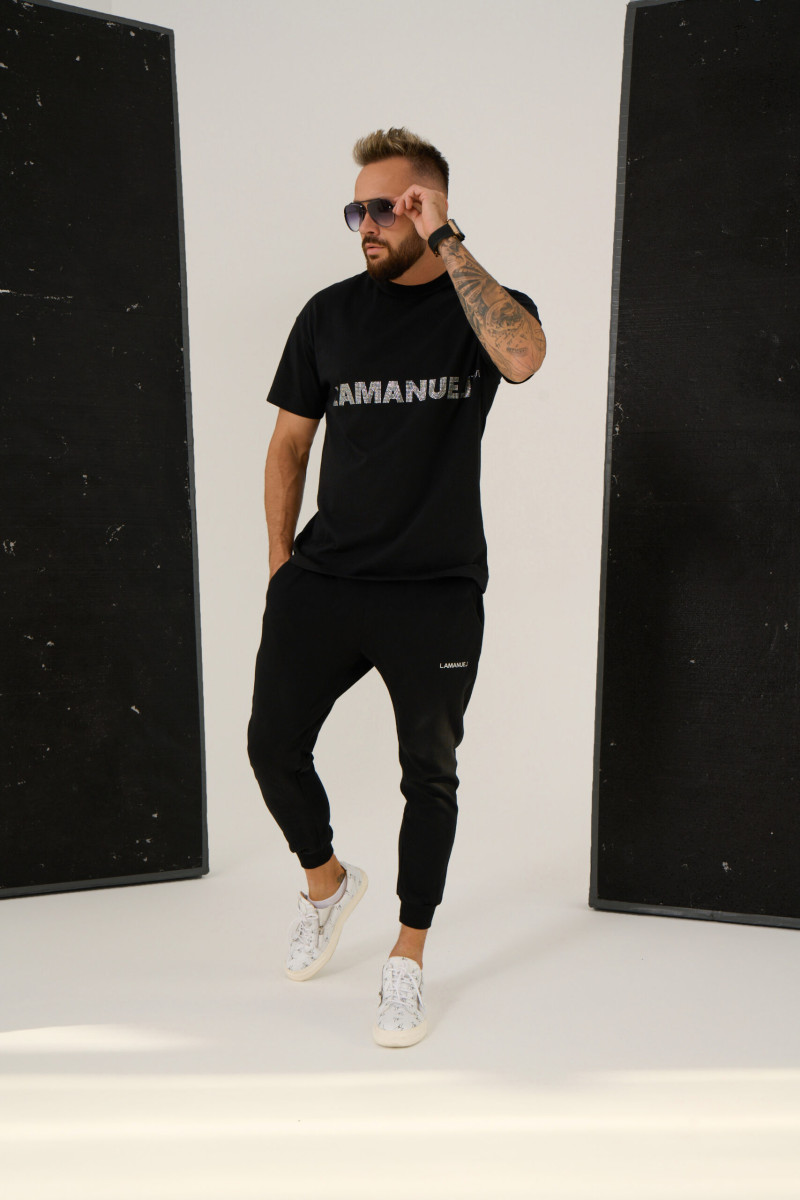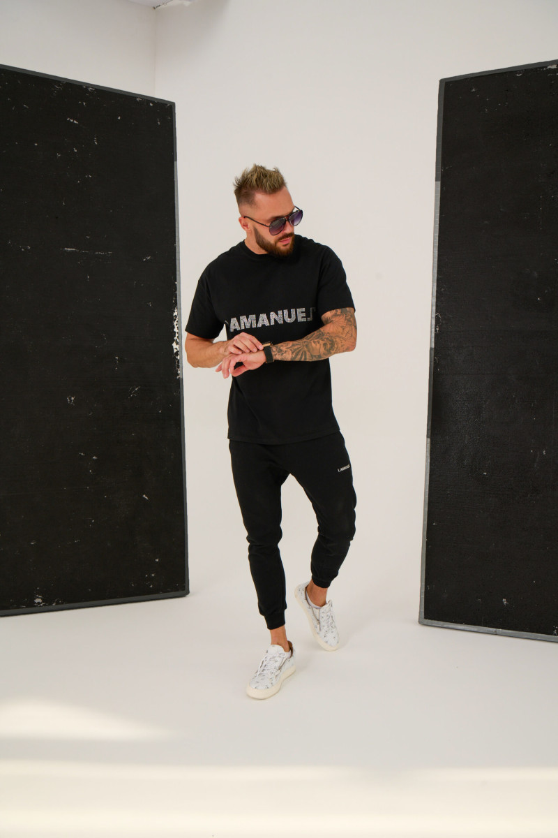 Czarna koszulka o swobodnym fasonie z charakterystycznym logiem marki „LAMANUEL TM” wykonanym z wysokiej jakości cekinów szlifowanych na klatce piersiowej. Wykonana z delikatnej polskiej bawełny.
