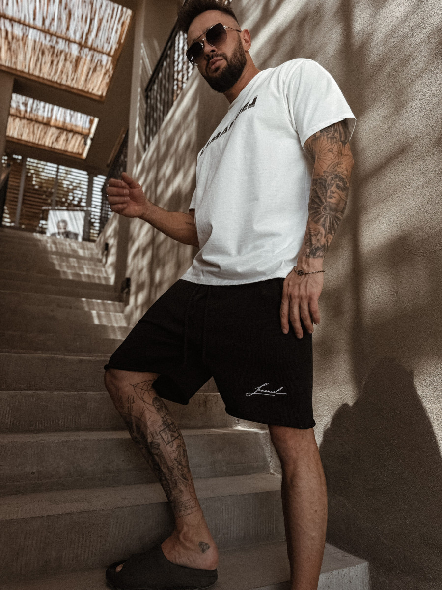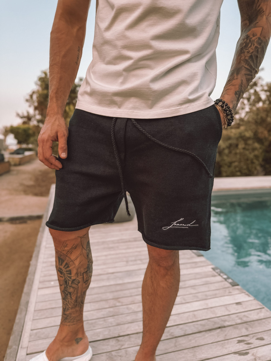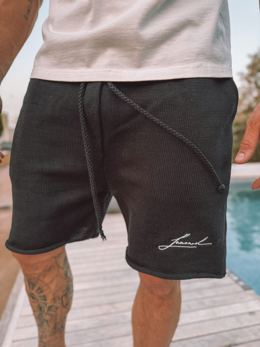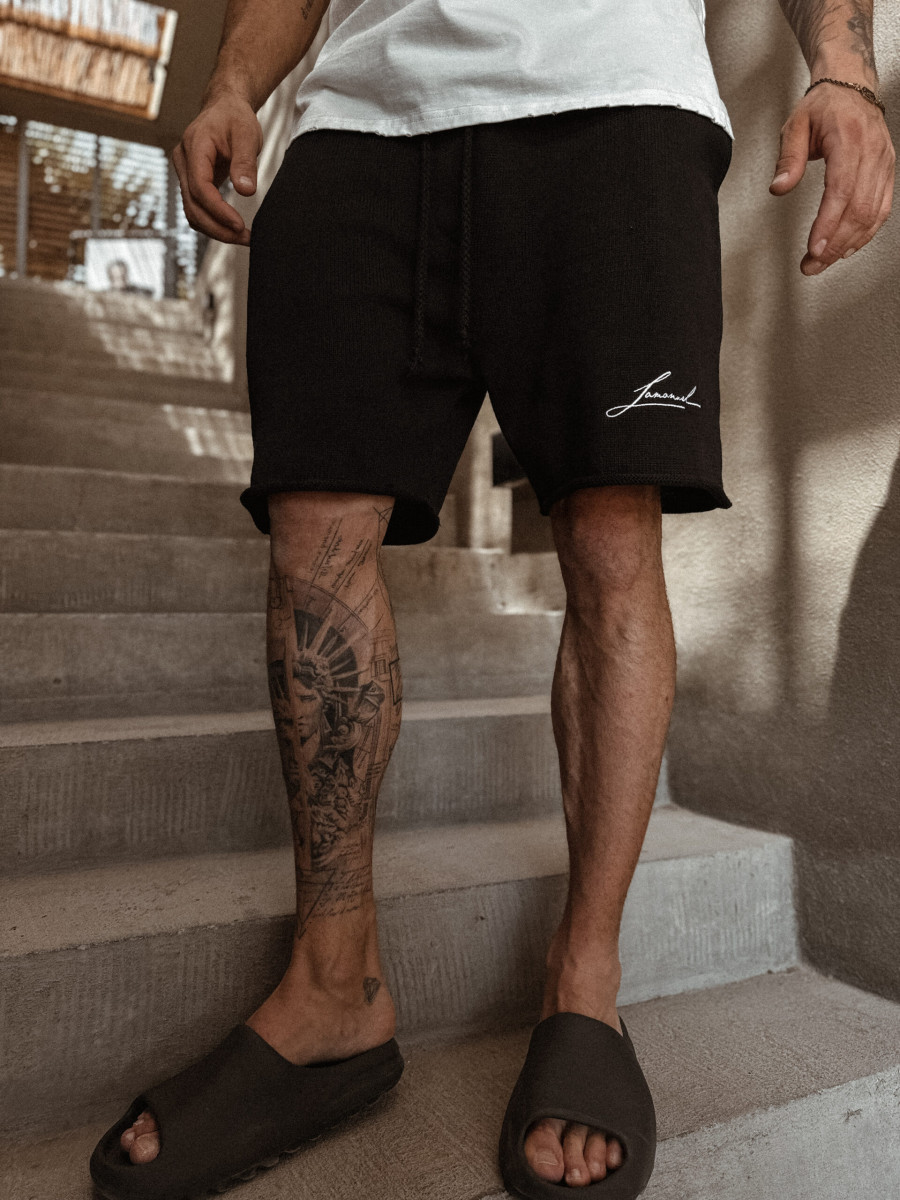 Bawełniane spodenki z dwiema kieszeniami o lekko luźniejszym kroju z haftowanym logo marki. Szorty posiadają gumę w pasie oraz sznurek dla jeszcze lepszej wygody. Wykonane dla naszej marki w polskiej dziewiarni.