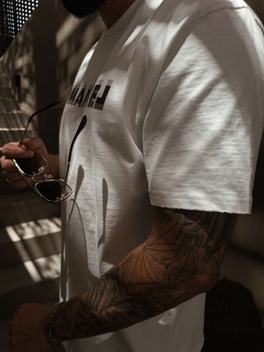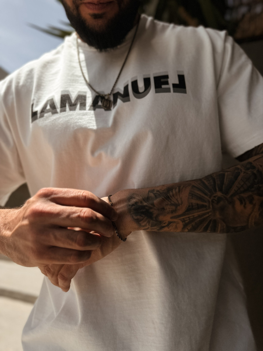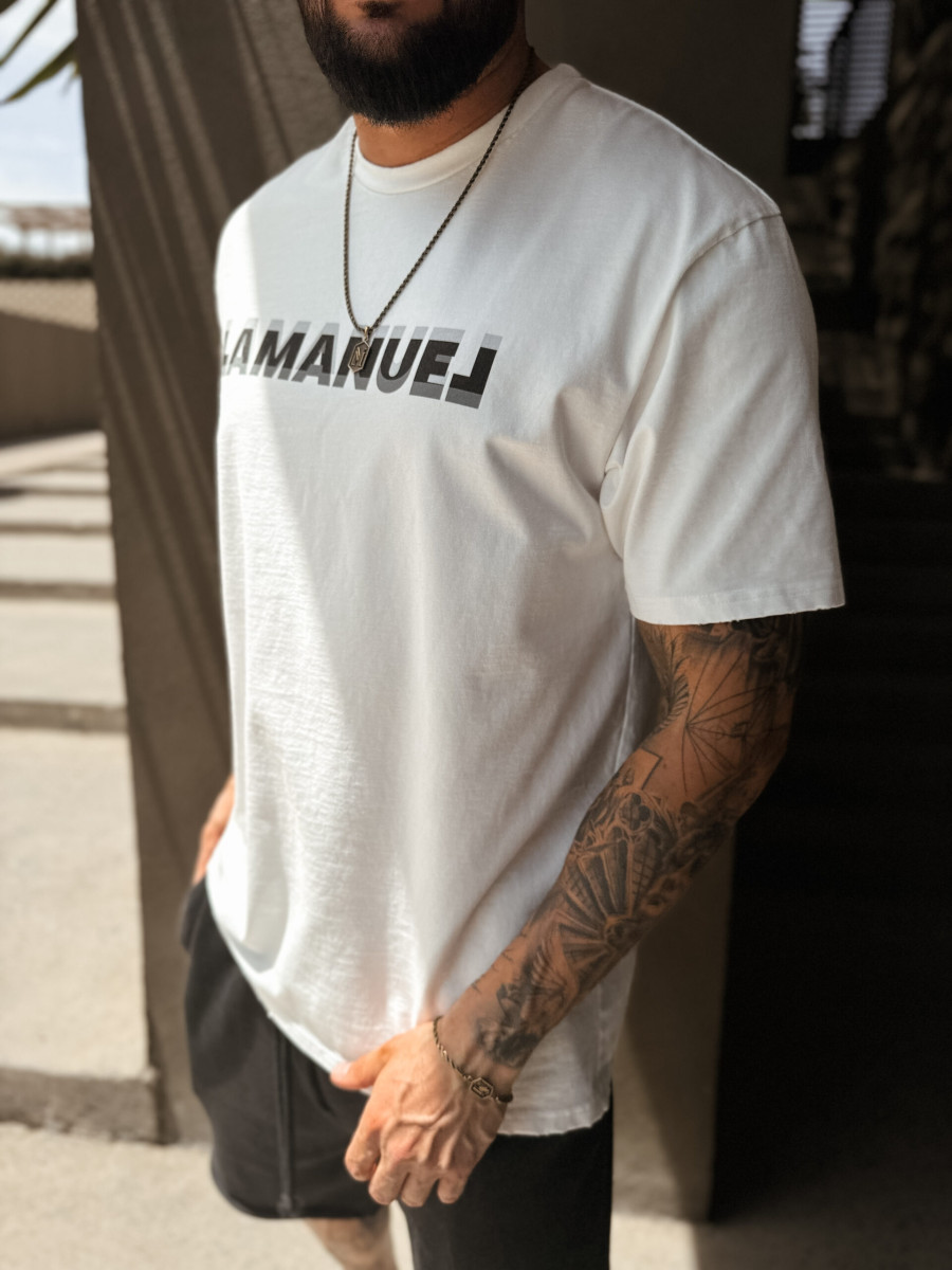 Koszulka z krótkim rękawem o regularnym delikatnie oversizowym kroju wykonana z grubej bawełny. Logo LAMANUEL na klatce piersiowej w wyjątkowym wydaniu. Poddana praniu „Vintage” i delikatnym uszkodzeniom na rękawkach i przy dekolcie dla jeszcze ciekawszego efektu.