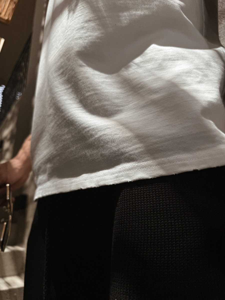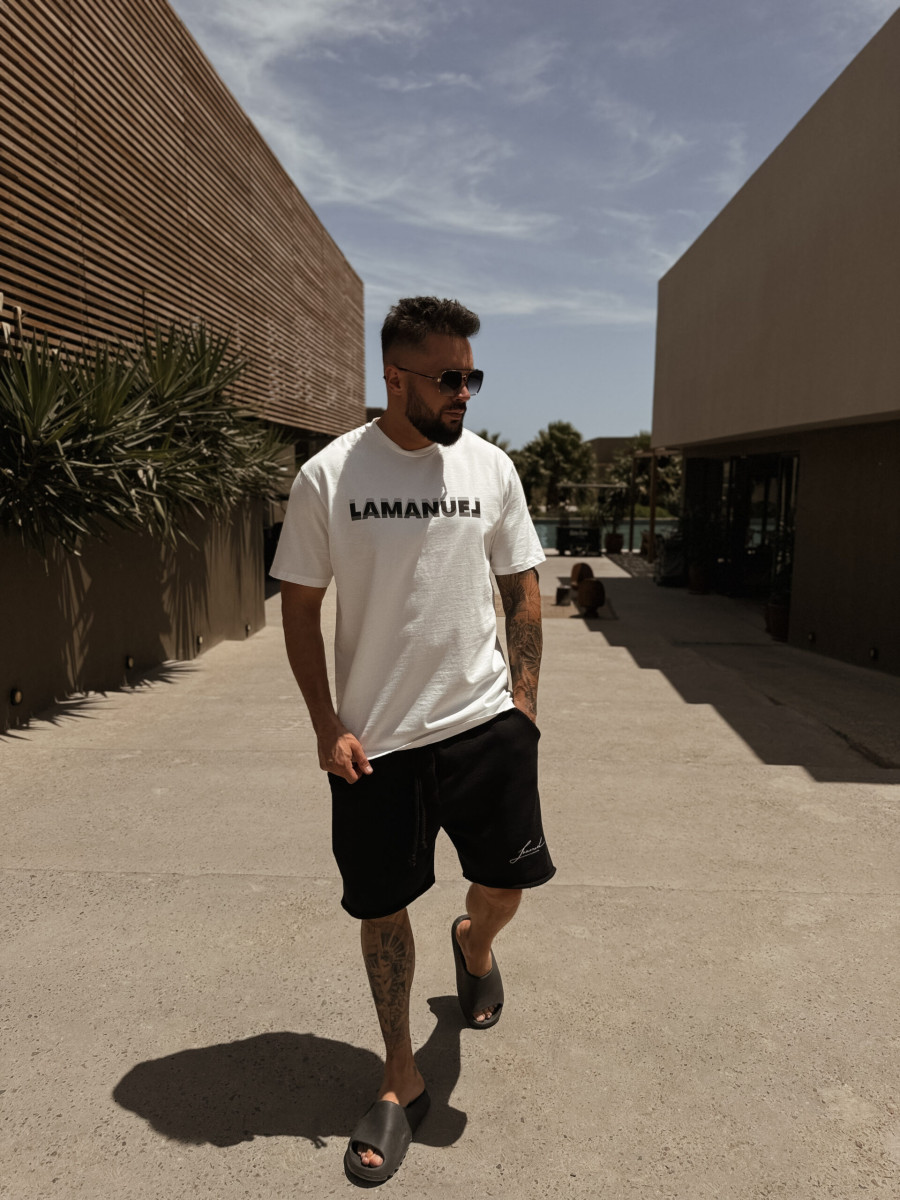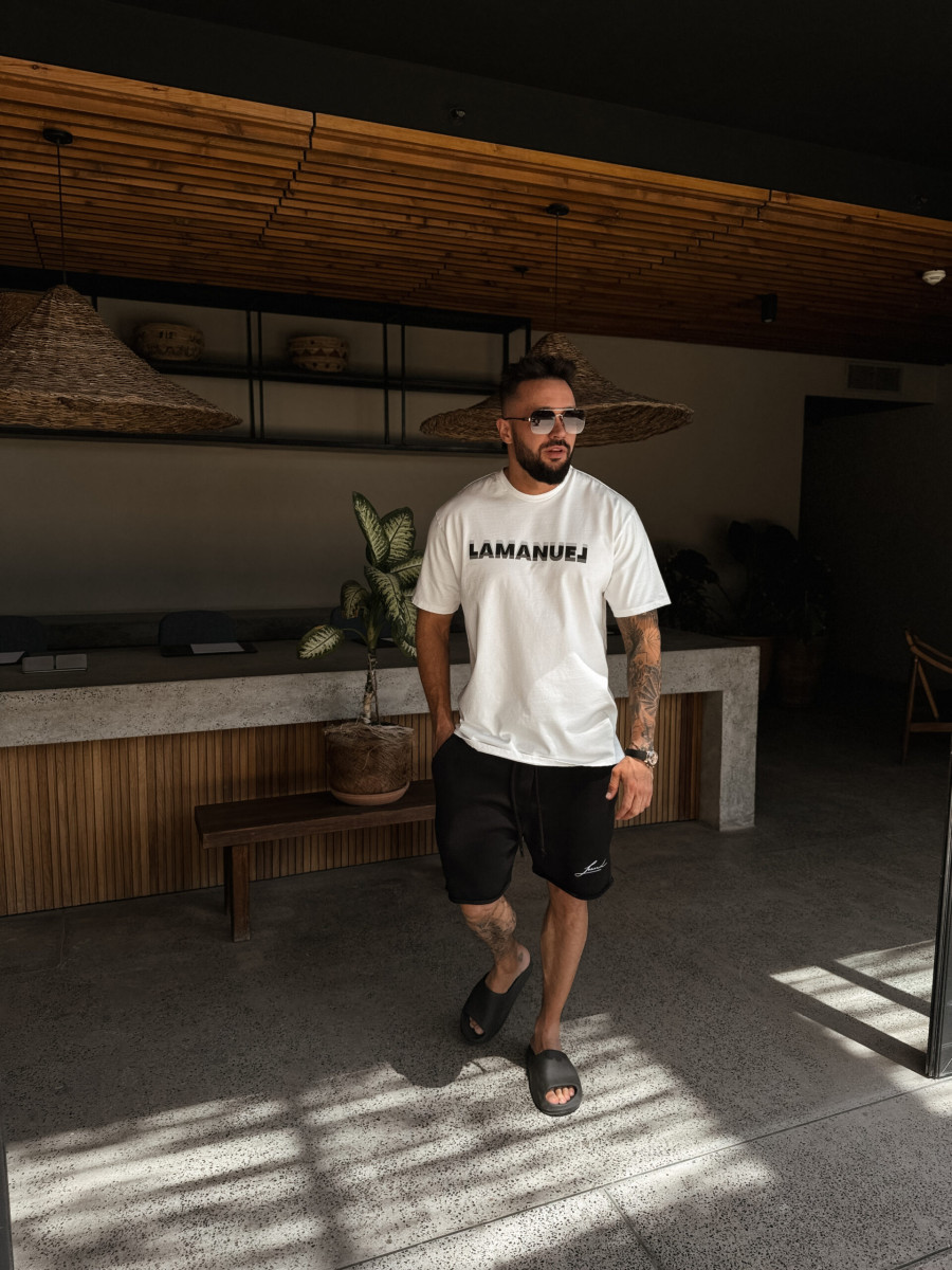 Koszulka z krótkim rękawem o regularnym delikatnie oversizowym kroju wykonana z grubej bawełny. Logo LAMANUEL na klatce piersiowej w wyjątkowym wydaniu. Poddana praniu „Vintage” i delikatnym uszkodzeniom na rękawkach i przy dekolcie dla jeszcze ciekawszego efektu.