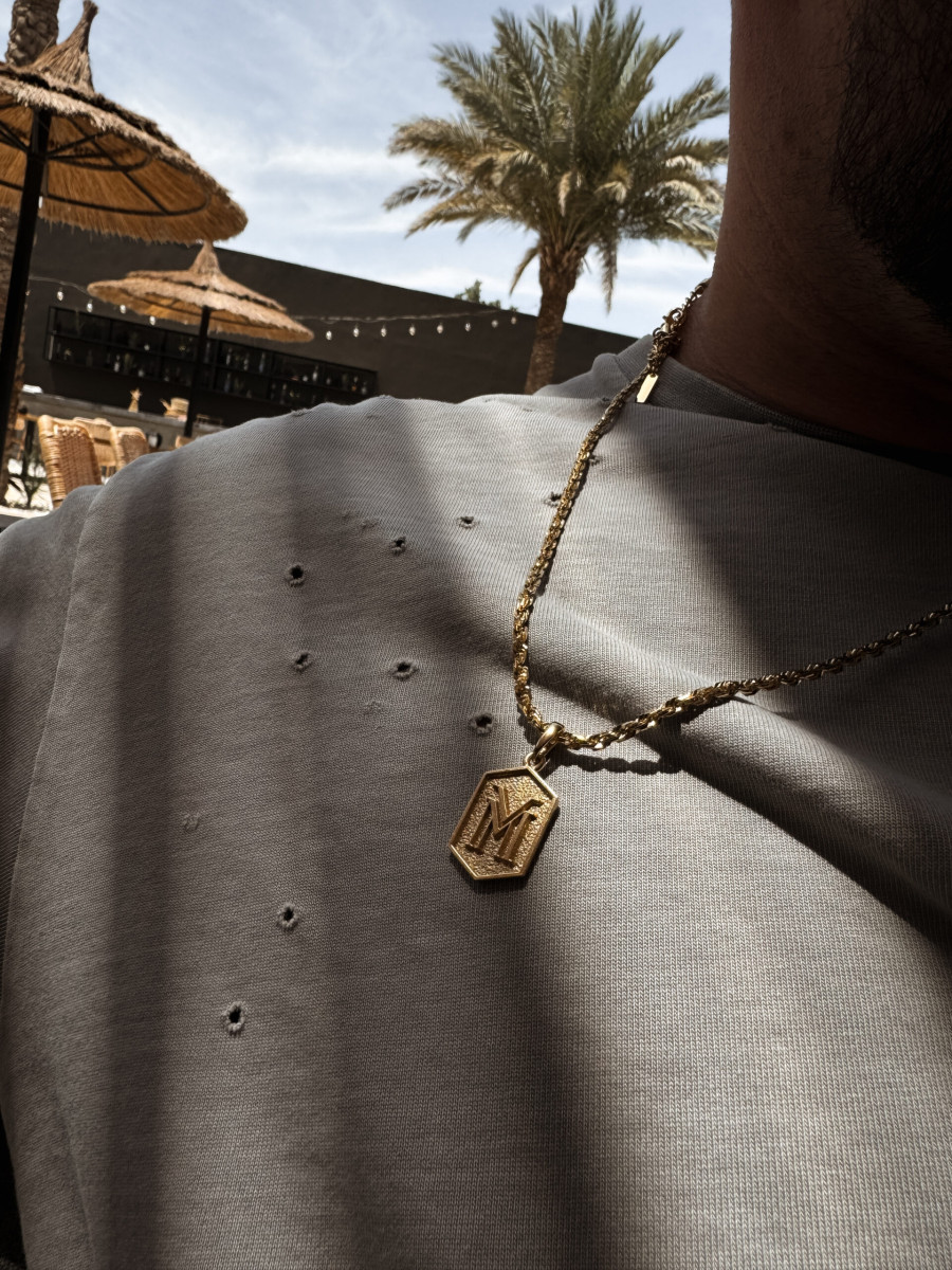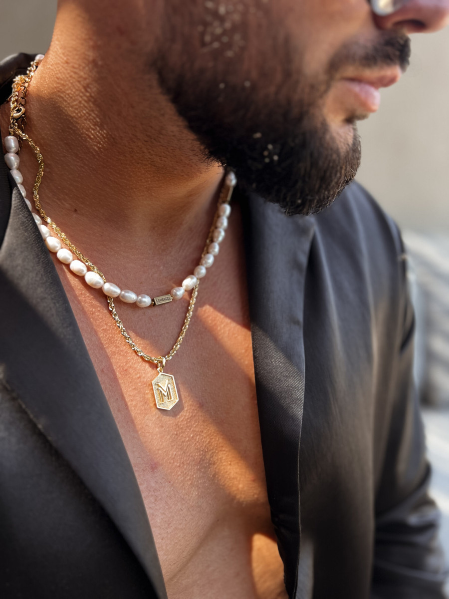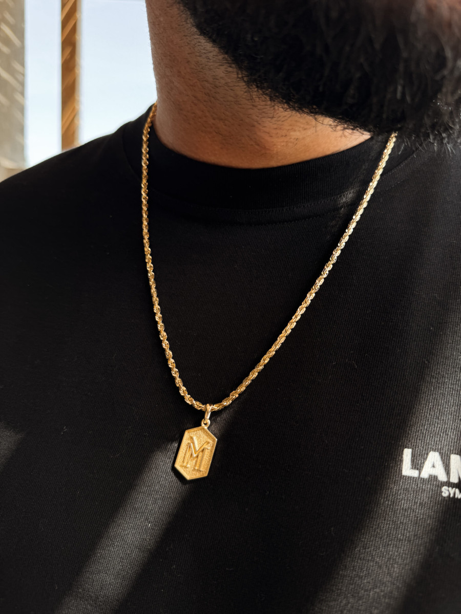Męski, pozłacany naszyjnik z ciekawym elementem łańcuszka oraz emblematem naszej marki. Dobierz go do zestawu z bransoletą initial tworząc idealne męskie połączenie.