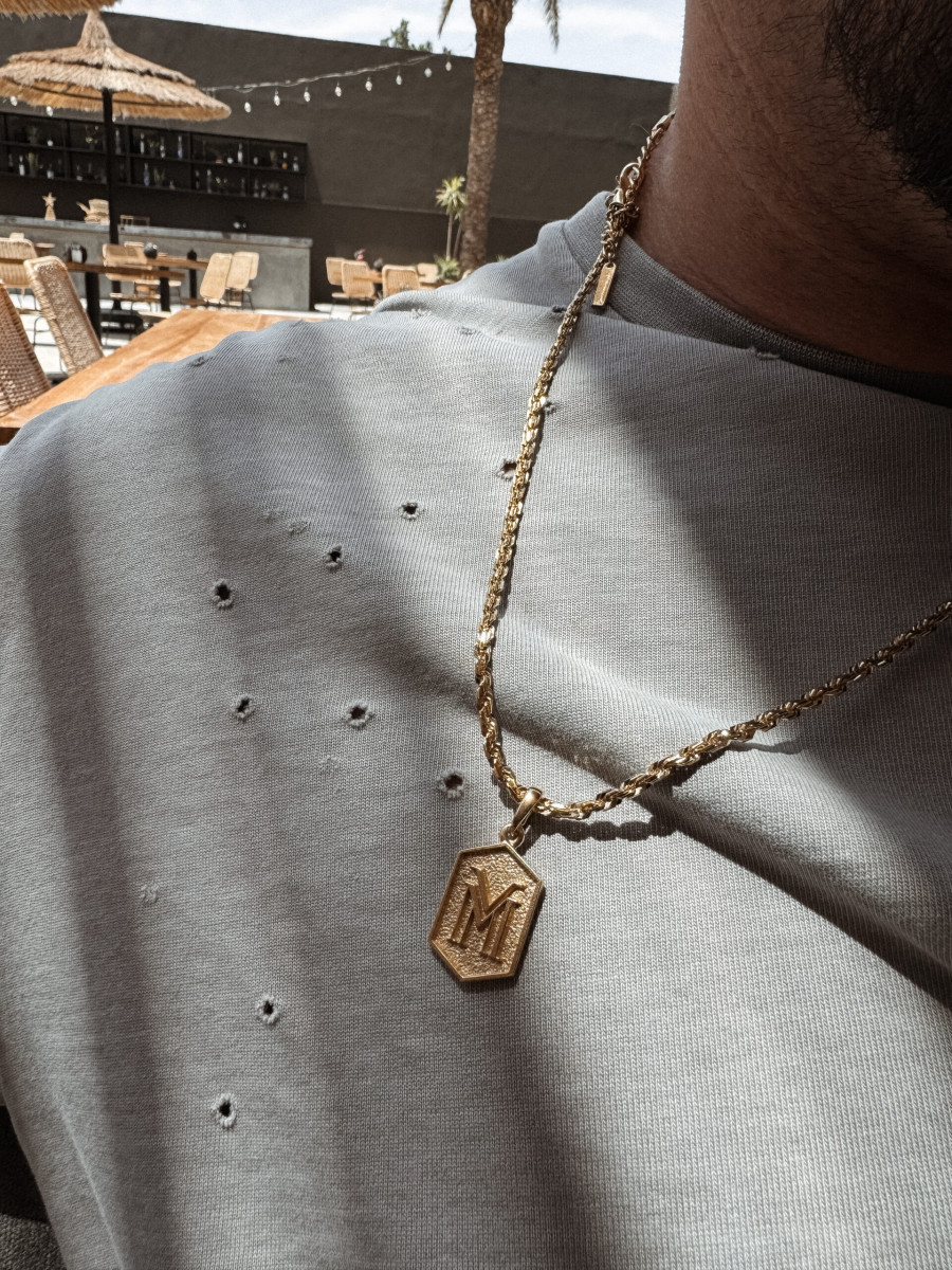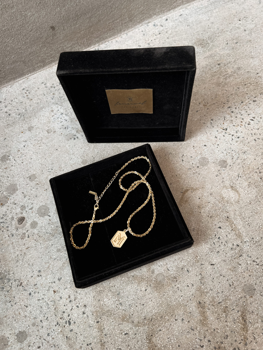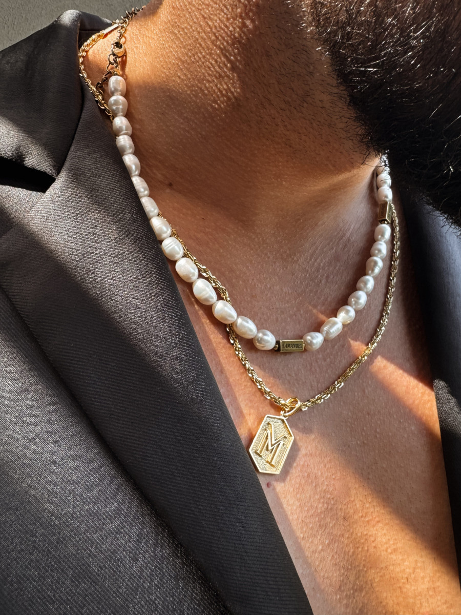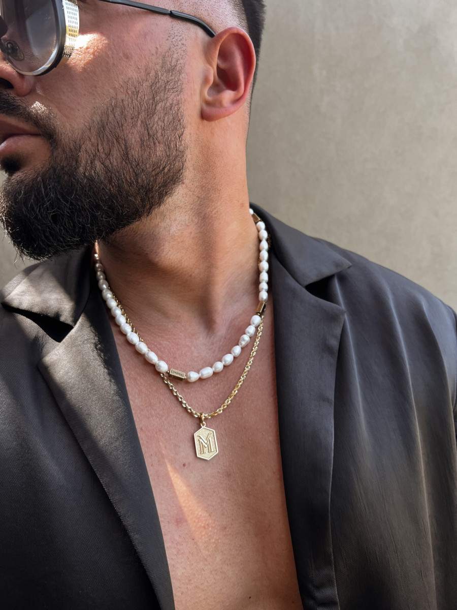 Męski, pozłacany naszyjnik z ciekawym elementem łańcuszka oraz emblematem naszej marki. Dobierz go do zestawu z bransoletą initial tworząc idealne męskie połączenie.