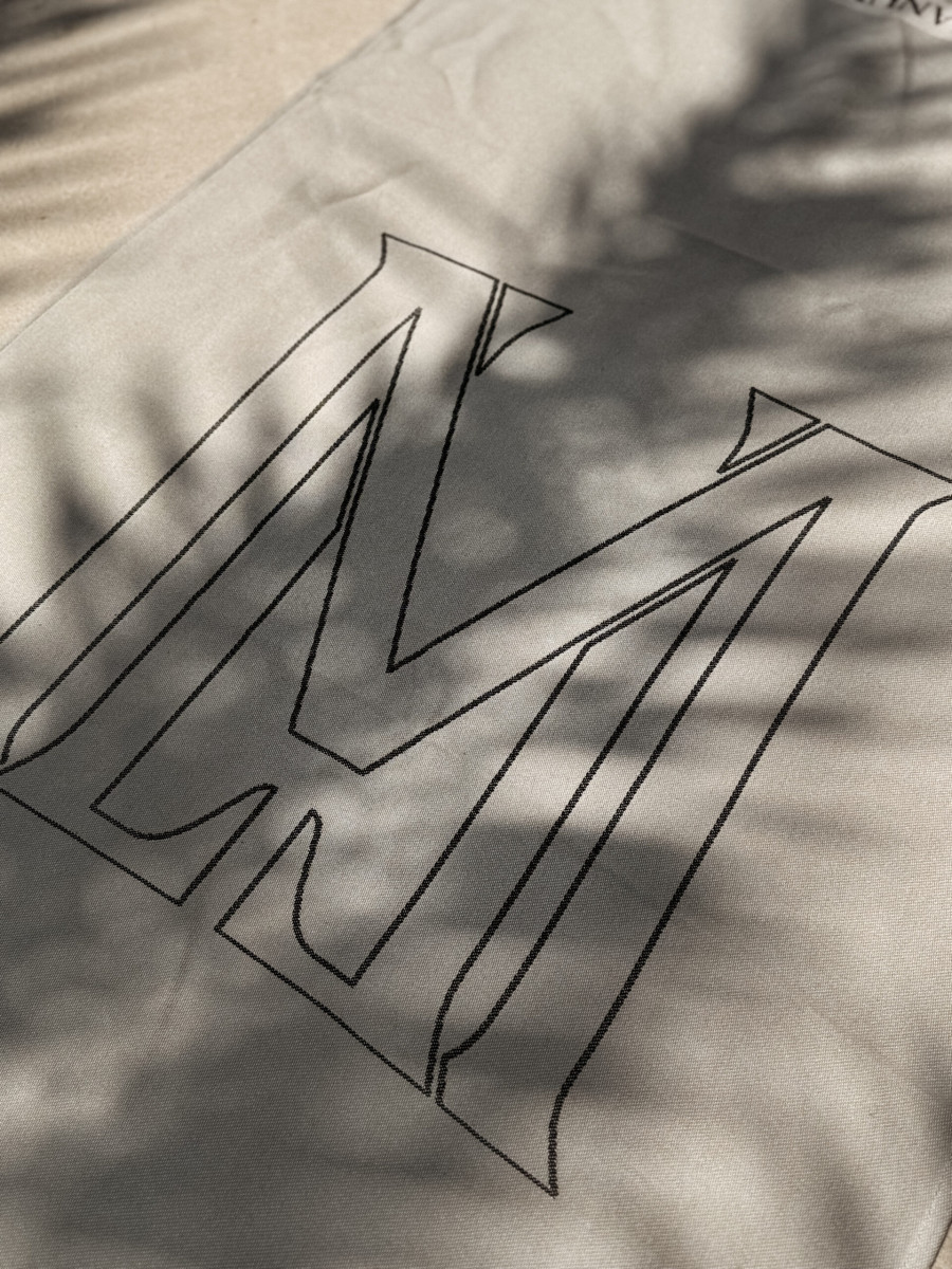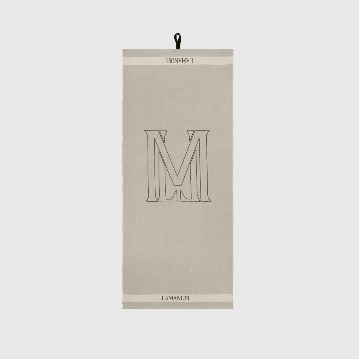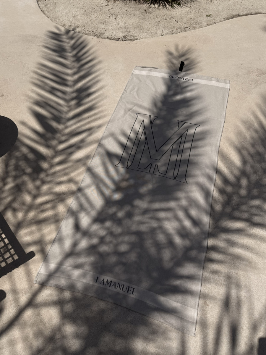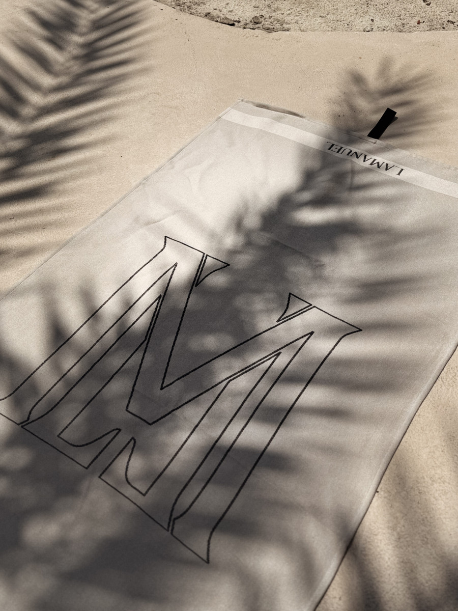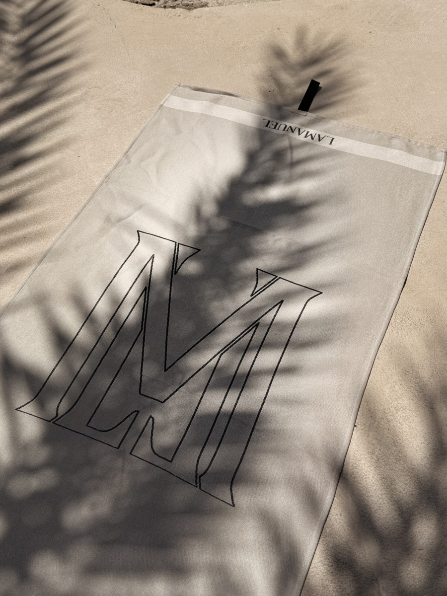 Model w stonowanym, naturalnym odcieniu z wyrazistym, graficznym monogramem "M" oraz subtelnym logo LAMANUEL przy krawędzi. Tkanina chłonna, przewiewna i szybkoschnąca – doskonale sprawdzi się zarówno na plaży, jak i przy basenie czy w domowej strefie relaksu.