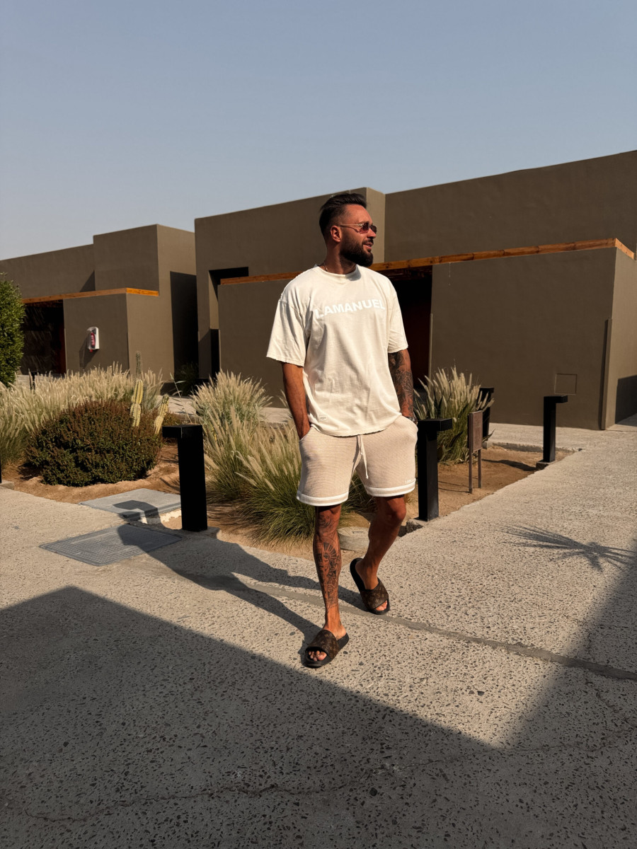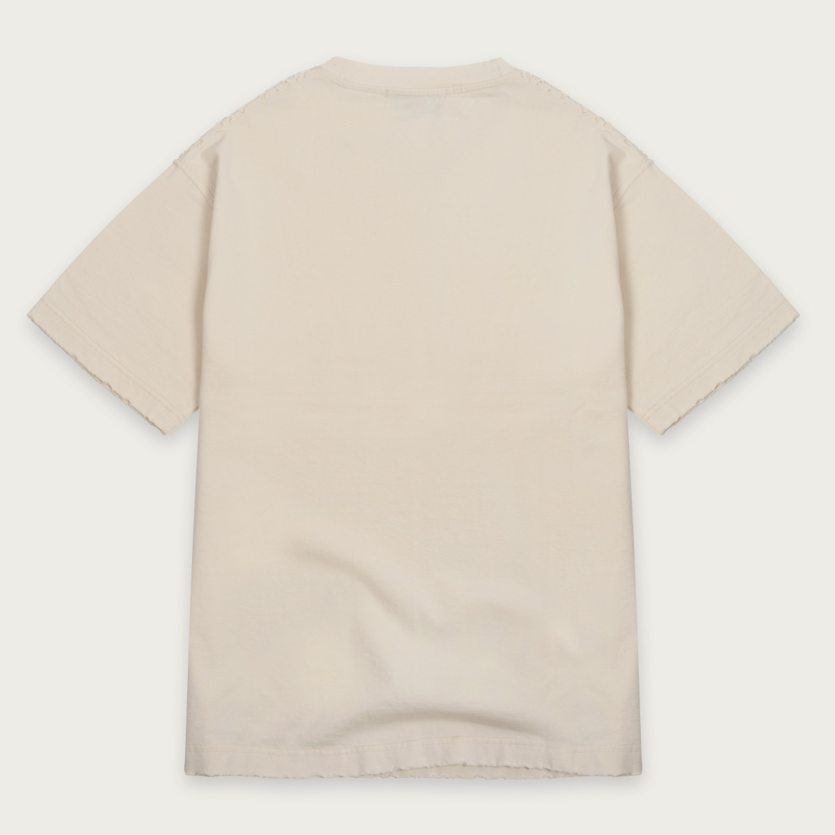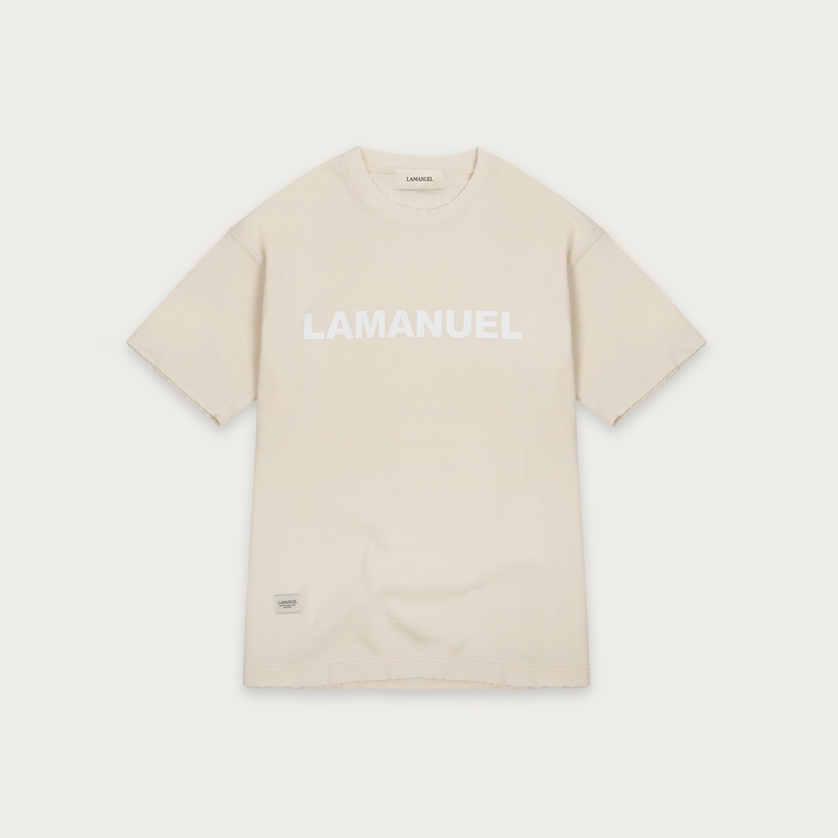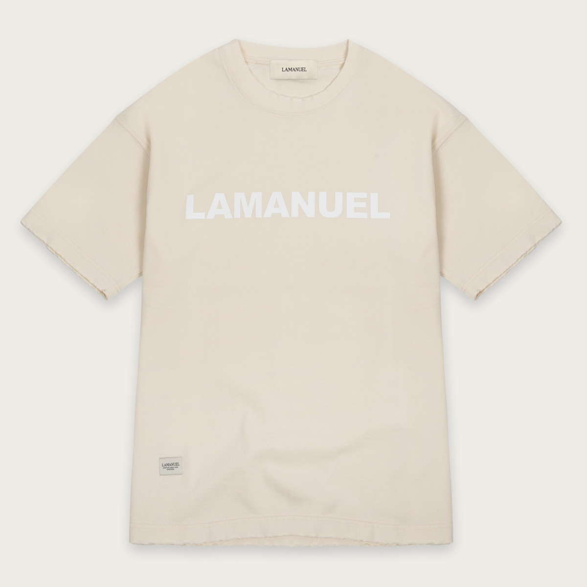 T-shirt o wyrazistym, oversizowym kroju, wykonany z wysokogatunkowej, 100% bawełny w odcieniu surowego creamu. Tkanina została poddana procesom uszlachetniania i zmiękczania, co nadaje jej wyjątkową miękkość i naturalną strukturę. Wykończony celowymi przetarciami na krawędziach, które wprowadzają szlachetną niedoskonałość – w duchu premium vintage. Z przodu znajduje się klasyczny print z logo LAMANUEL, a na dole wszyto subtelną, żakardową metkę brandingową – minimalistyczny, ale świadomy detal.