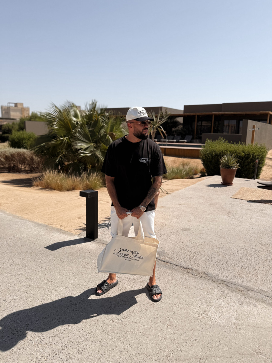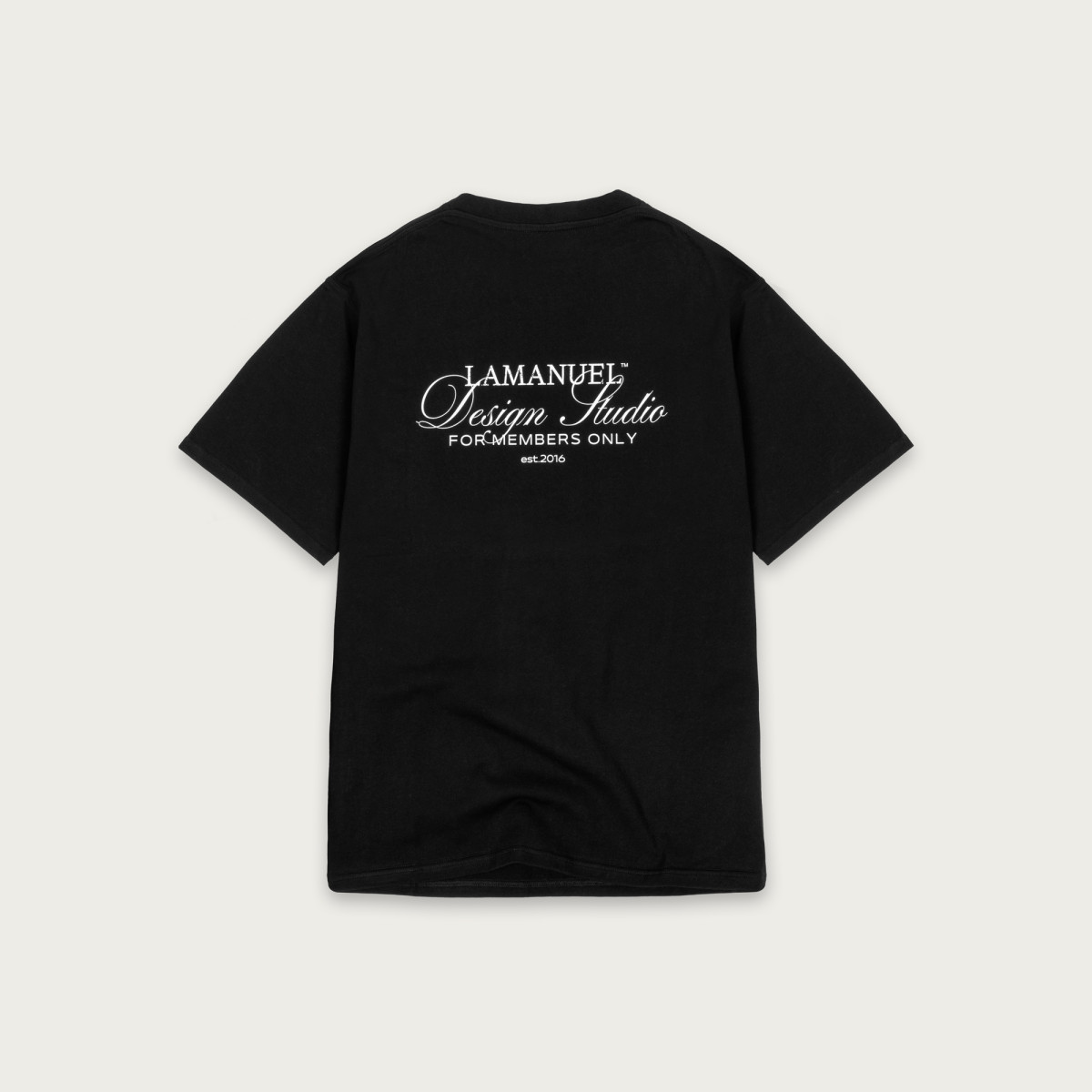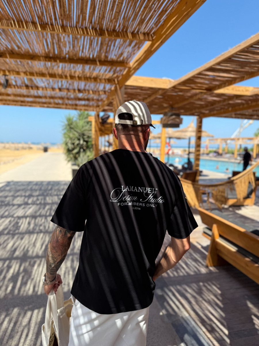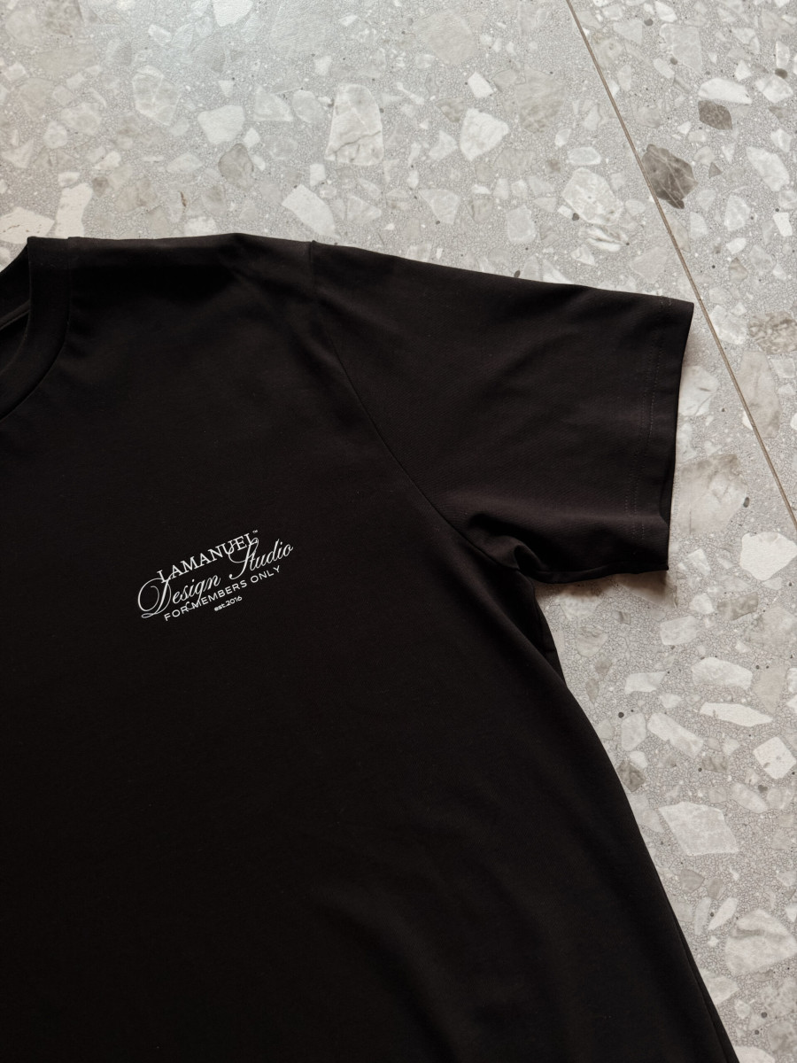 Lekko oversize’owy t-shirt wykonany z wysokogatunkowej, mięsistej bawełny, która świetnie się układa i daje pełen komfort noszenia. Na piersi znajduje się subtelny nadruk „LAMANUEL Design Studio”, a większa wersja tego motywu umieszczona jest na plecach – balansując między minimalizmem a charakterem.
