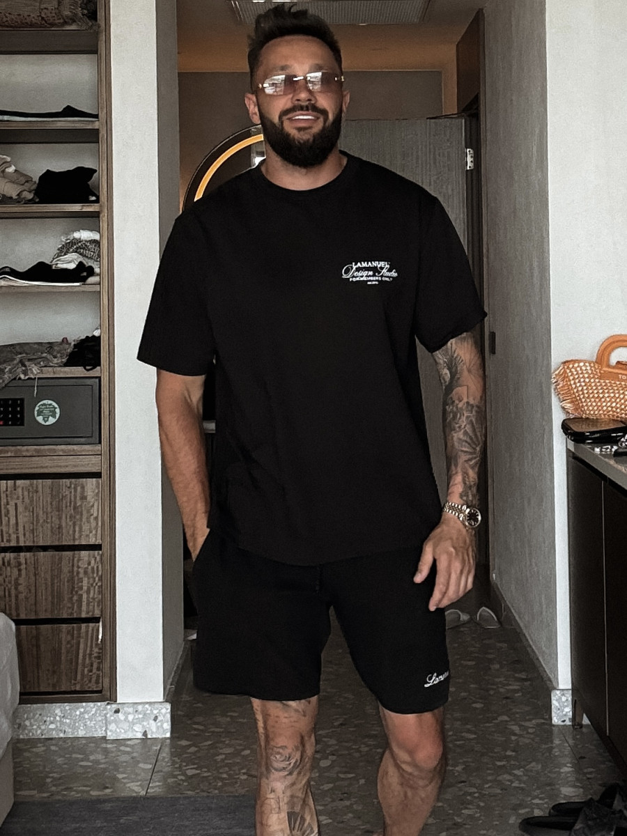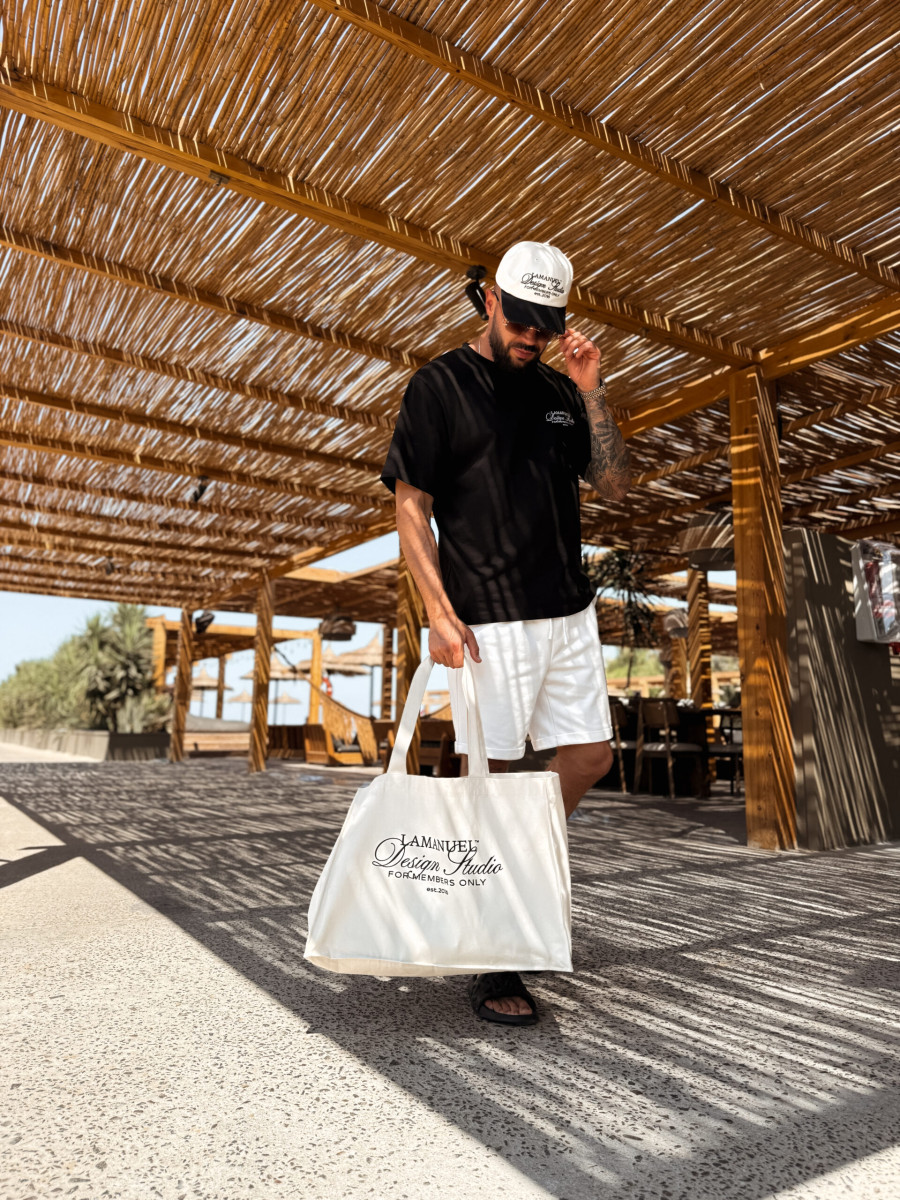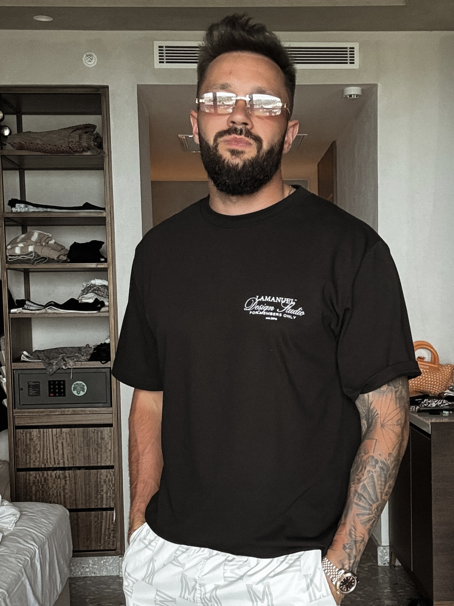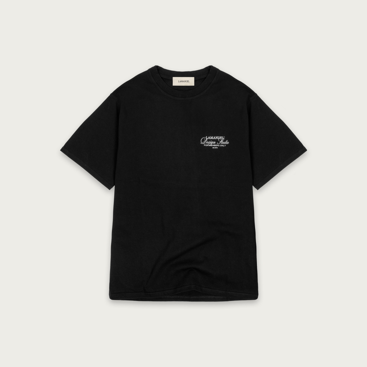 Lekko oversize’owy t-shirt wykonany z wysokogatunkowej, mięsistej bawełny, która świetnie się układa i daje pełen komfort noszenia. Na piersi znajduje się subtelny nadruk „LAMANUEL Design Studio”, a większa wersja tego motywu umieszczona jest na plecach – balansując między minimalizmem a charakterem.