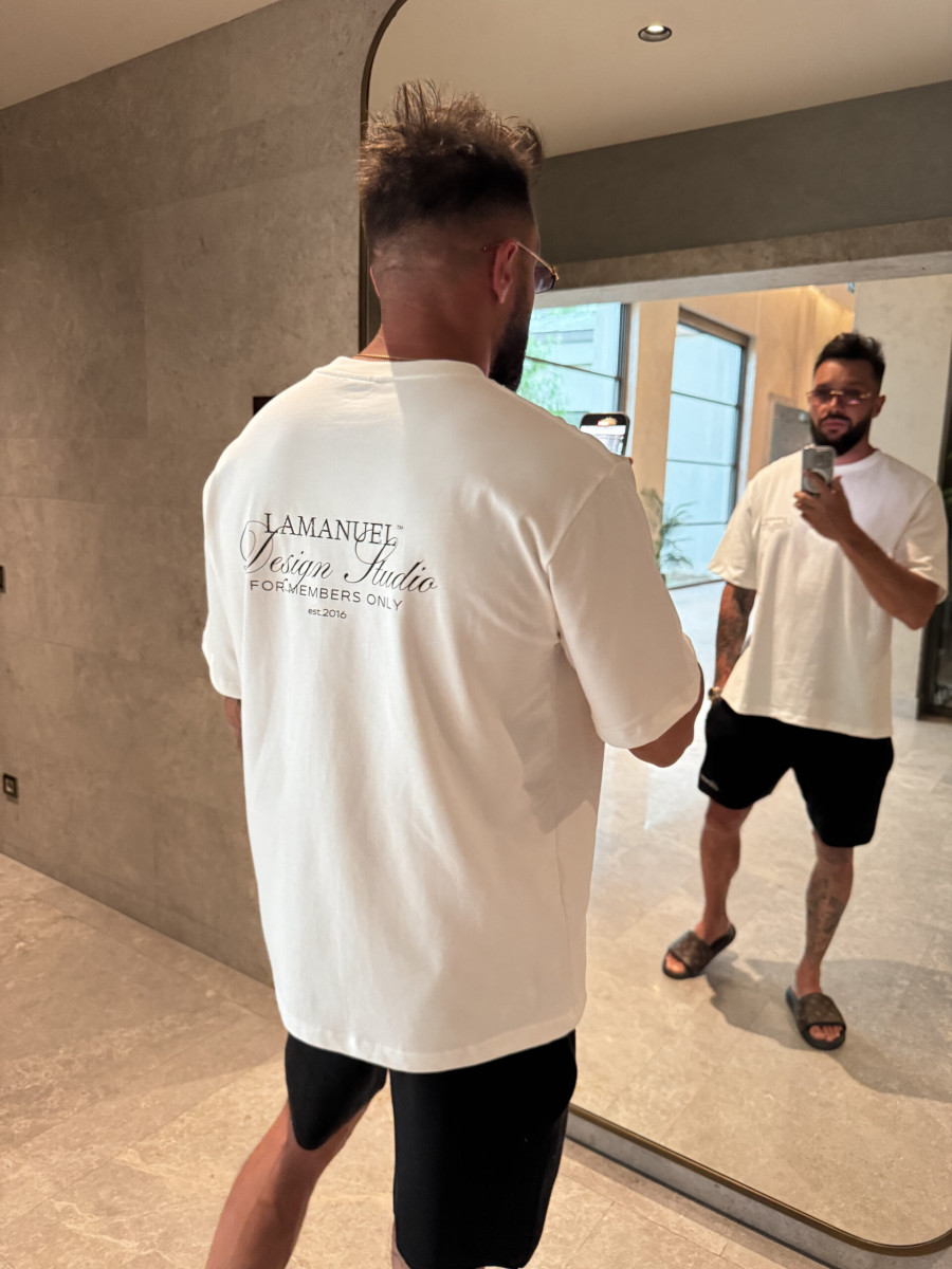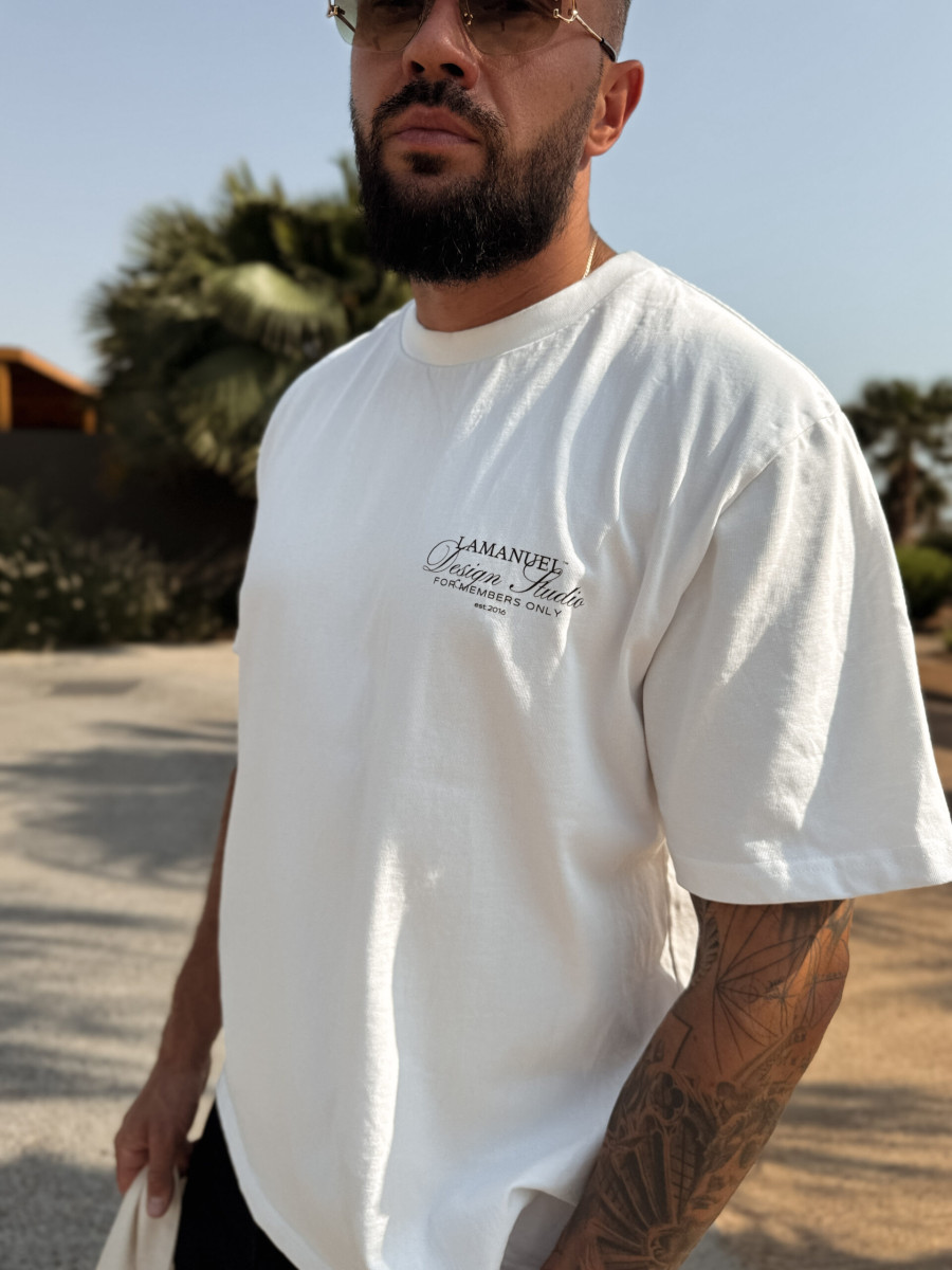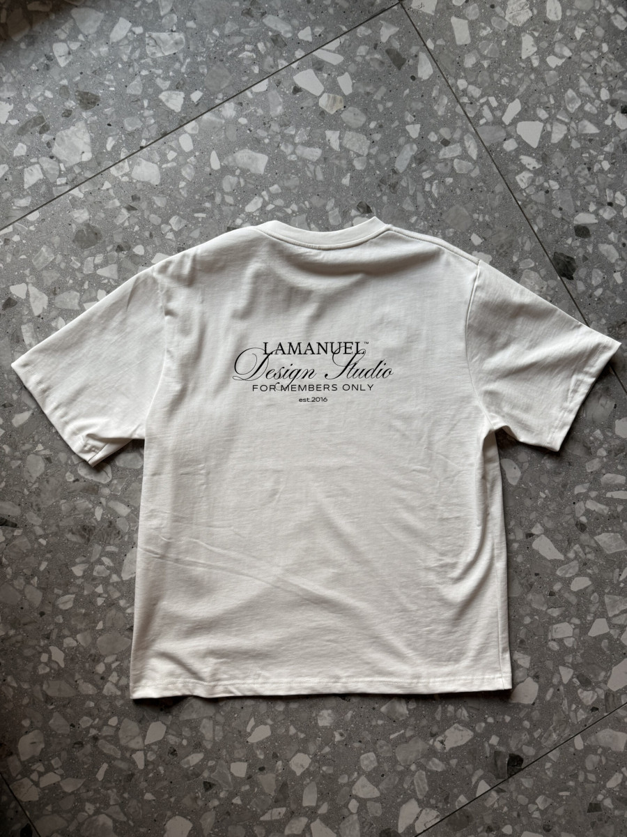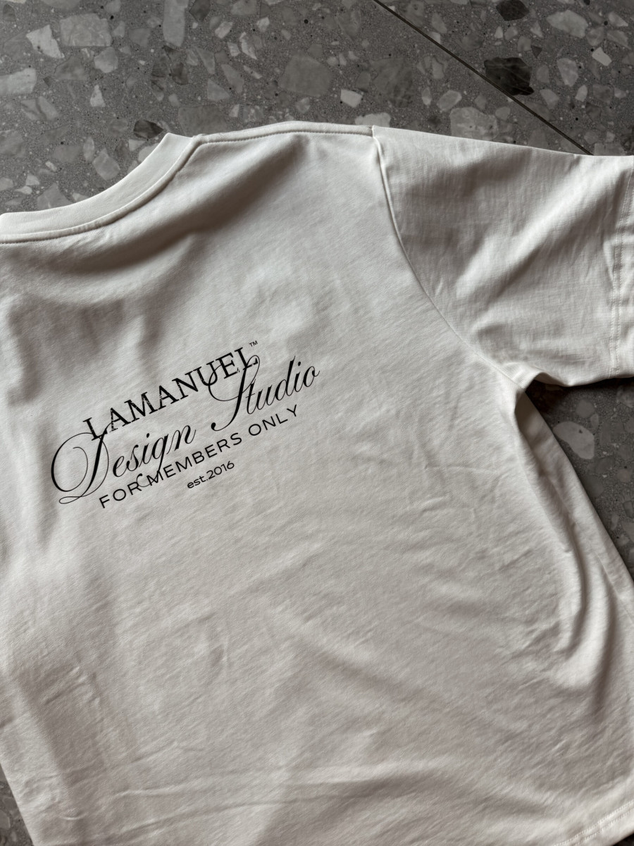 Lekko oversize’owy t-shirt wykonany z wysokogatunkowej, mięsistej bawełny, która świetnie się układa i daje pełen komfort noszenia. Na piersi znajduje się subtelny nadruk „LAMANUEL Design Studio”, a większa wersja tego motywu umieszczona jest na plecach – balansując między minimalizmem a charakterem.