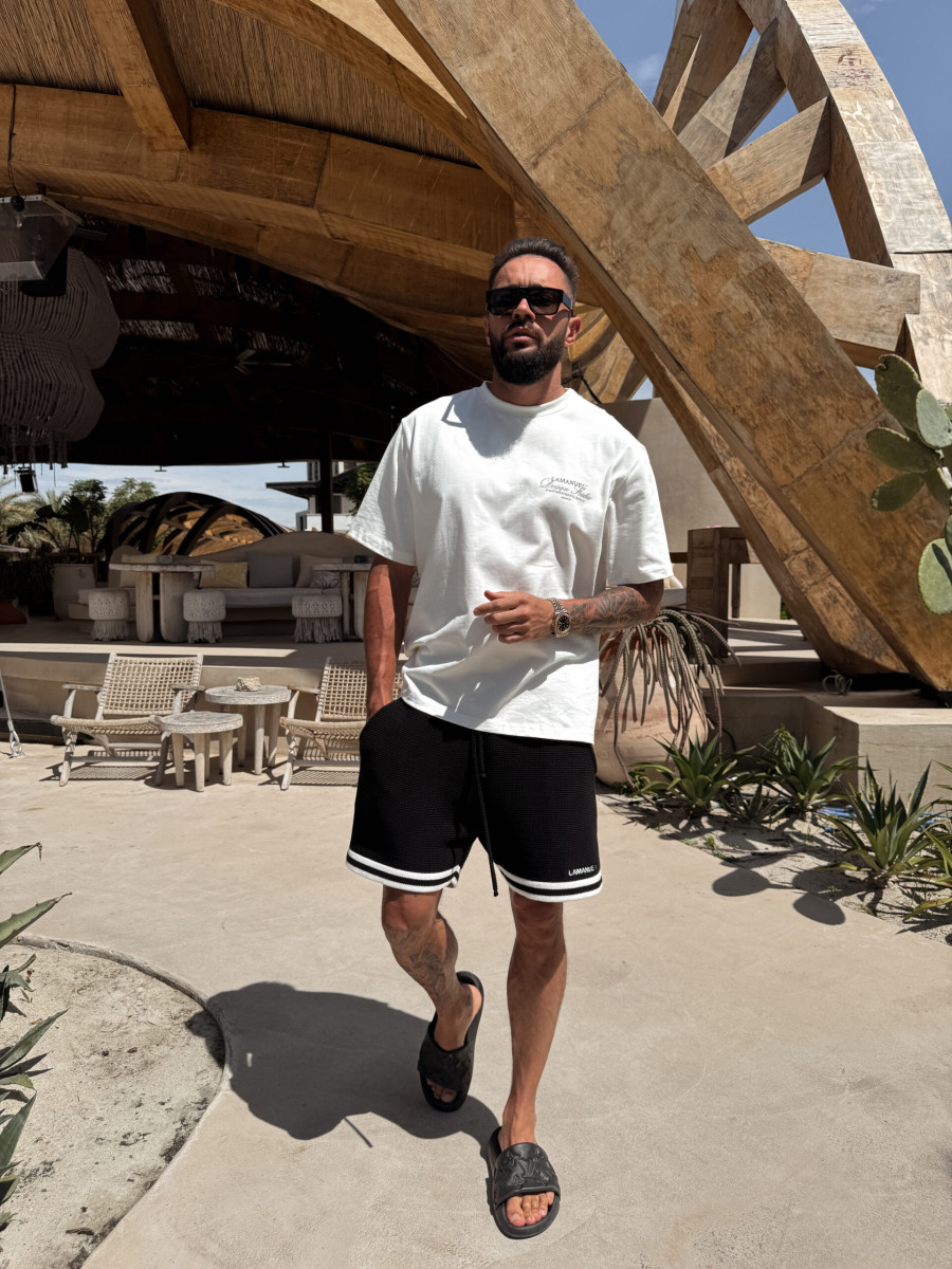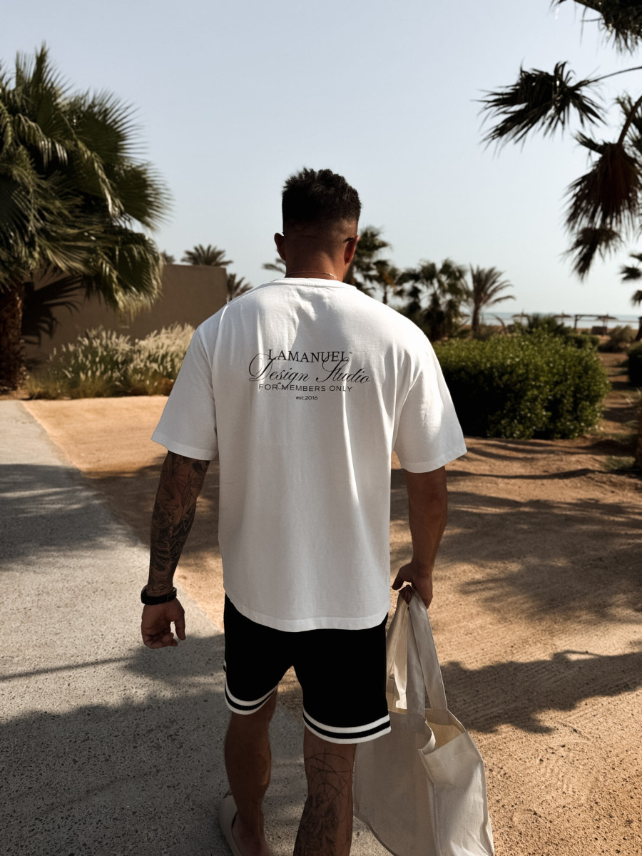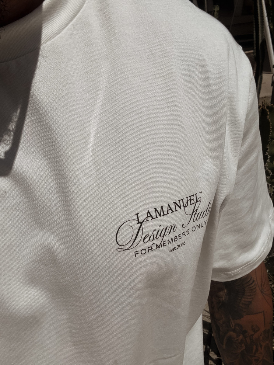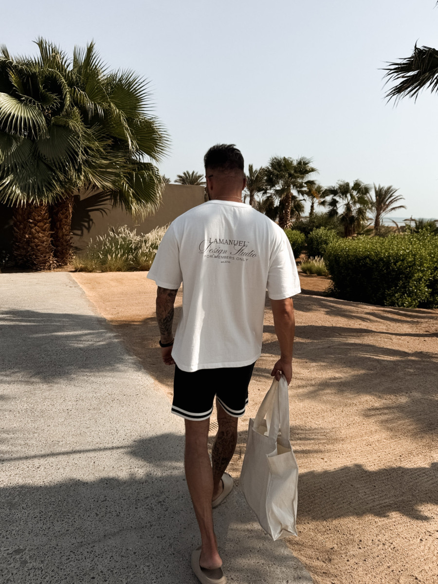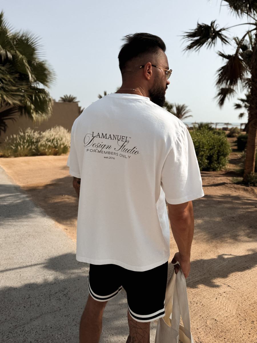 Lekko oversize’owy t-shirt wykonany z wysokogatunkowej, mięsistej bawełny, która świetnie się układa i daje pełen komfort noszenia. Na piersi znajduje się subtelny nadruk „LAMANUEL Design Studio”, a większa wersja tego motywu umieszczona jest na plecach – balansując między minimalizmem a charakterem.