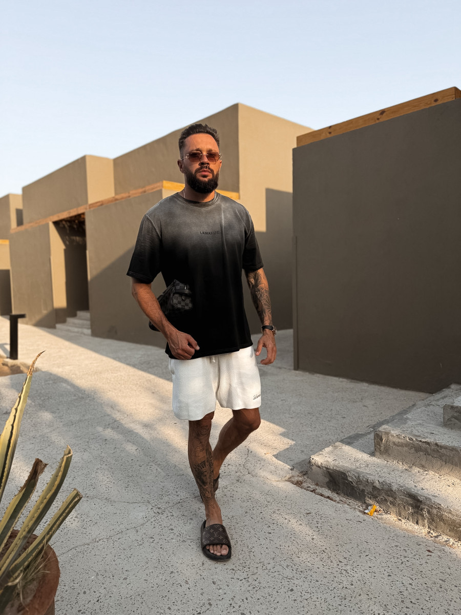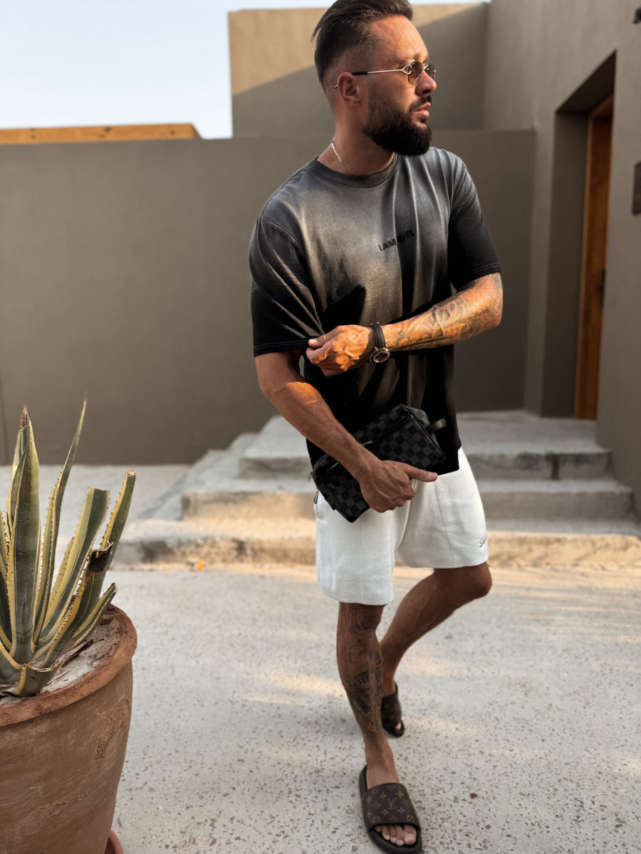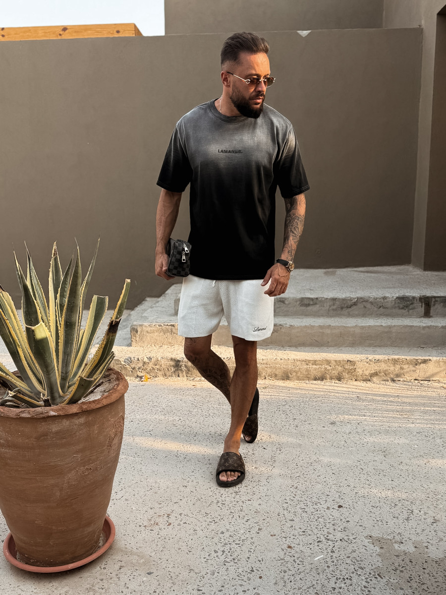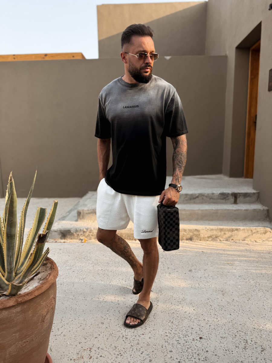 T-shirt o lekko oversizowym kroju, wykonany z wysokogatunkowej, polskiej bawełny, poddanej procesom zmiękczania i wstępnego barwienia. Każdy egzemplarz jest następnie ręcznie farbowany, co tworzy efekt subtelnego ombré – z jaśniejszym tonem przy karku i głębszym kolorem ku dołowi. Na środku piersi umieszczono czarne, silikonowe logo LAMANUEL – minimalistyczne, eleganckie, idealnie zintegrowane z kolorem tkaniny.