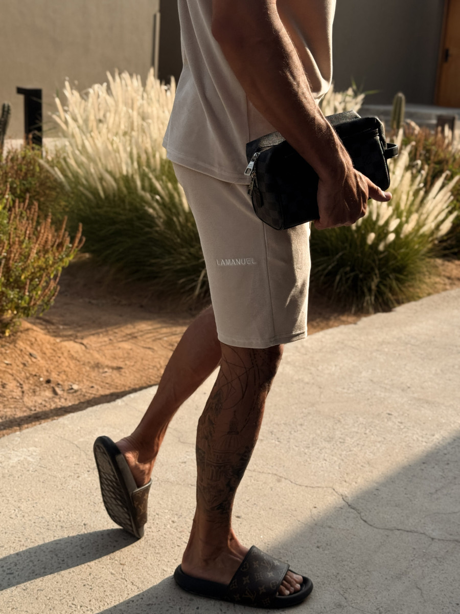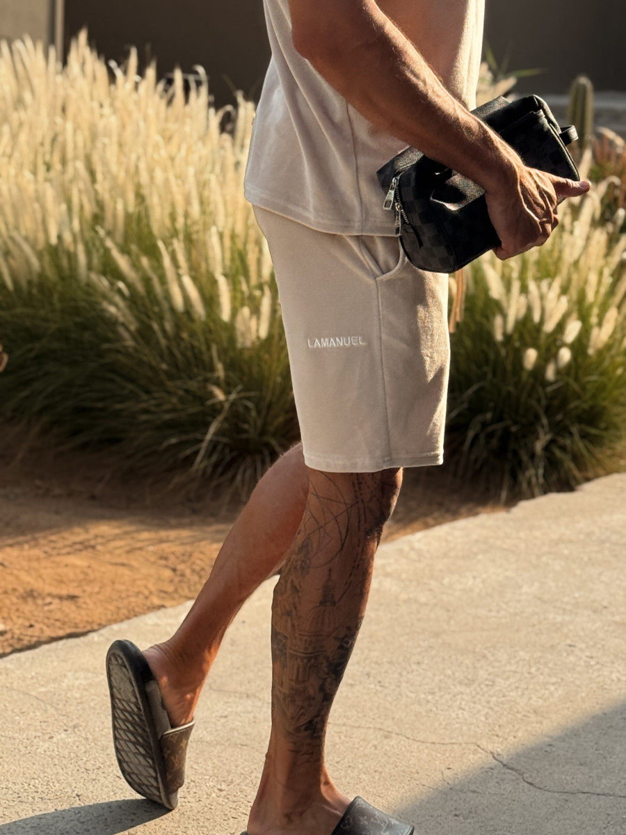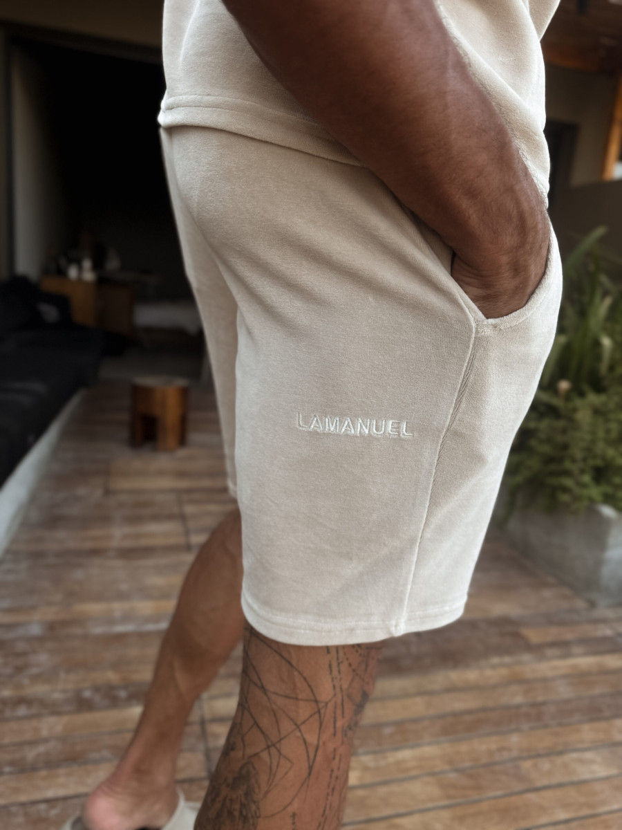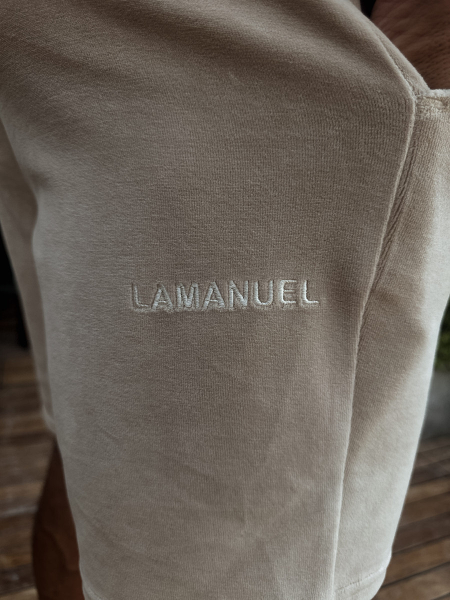 Szorty z bawełnianego weluru, zaprojektowane z myślą o nowoczesnym relaksie w najlepszym stylu. Na tyle jednej z nogawek znajduje się haft z logo LAMANUEL – umieszczony w niestandardowym miejscu, które podkreśla indywidualny charakter projektu. Krój dopasowany do sylwetki, a jednocześnie zapewniający pełen komfort. Idealnie pasują do welurowej koszulki z tej samej kolekcji – razem tworzą spójny i stylowy letni zestaw.