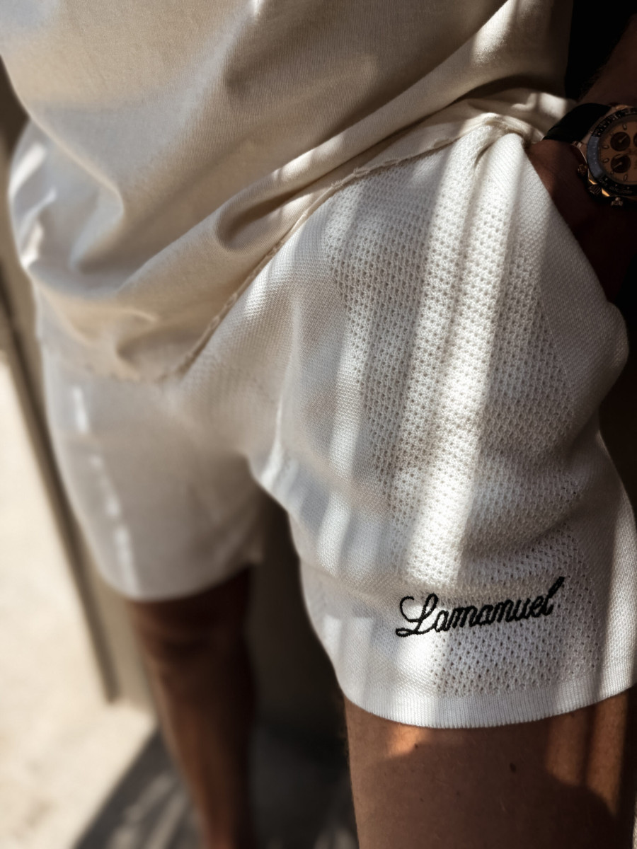 Sweterkowe szorty wykonane z wysokiej jakości dzianiny o sweterkowej strukturze, zaprojektowane z myślą o nowoczesnym, letnim stylu życia. Delikatna struktura materiału oraz subtelny haft łańcuszkowy z logo LAMANUEL podkreślają ich elegancki i ponadczasowy charakter.