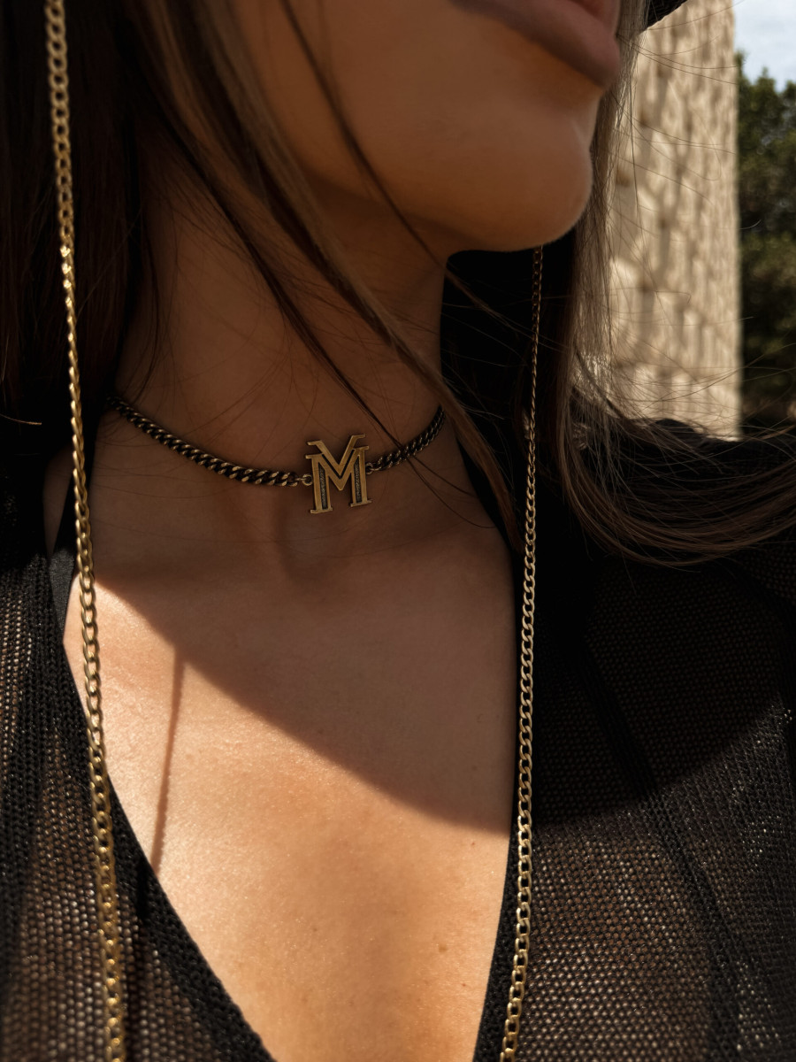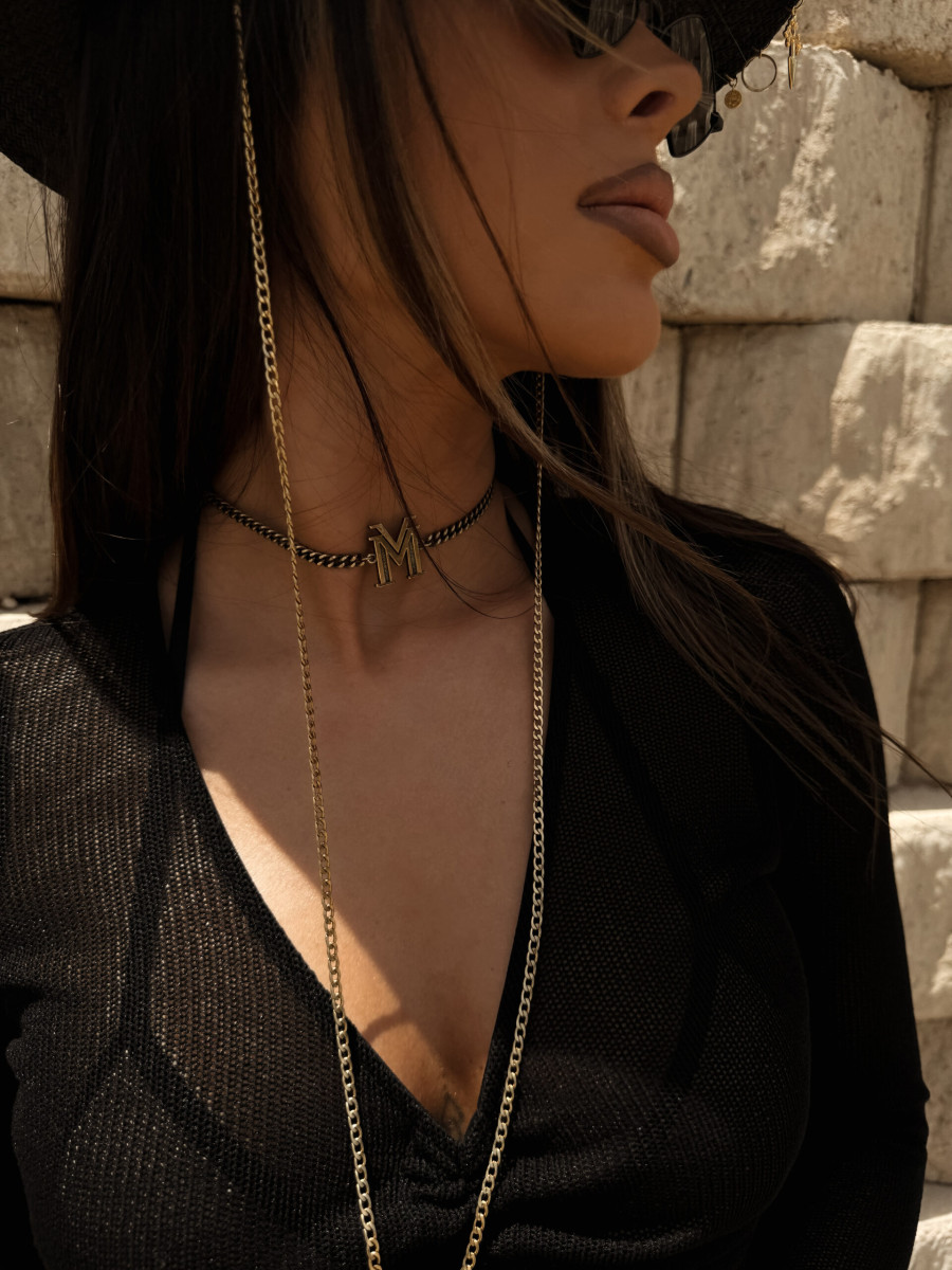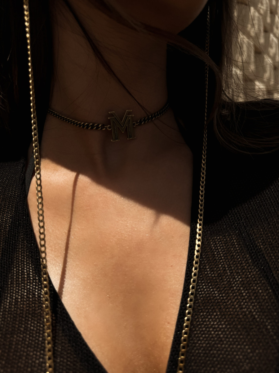 Podkreśl swój styl z naszym eleganckim chokerem z literką M. Ten minimalistyczny, lecz wyrafinowany dodatek dodaje subtelnej osobowości każdej stylizacji. Wykonany z delikatnego łańcuszka, choker z logo M stanowi wyraz klasy i elegancji, który przyciąga spojrzenia i dodaje uroku każdemu outfitowi.. Posiada również logowanie przy zapięciu.