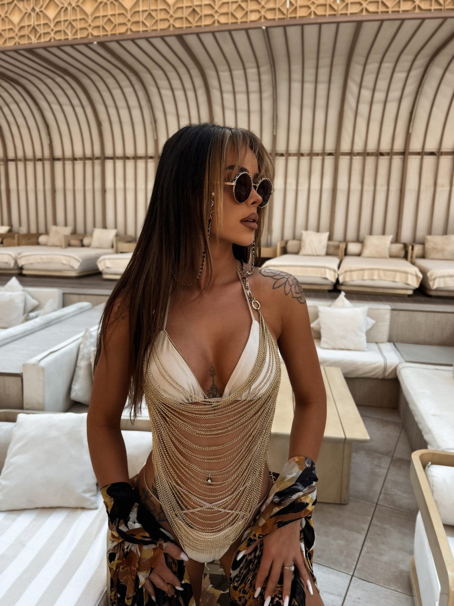 Dopełnij swoją stylizację z naszym wyjątkowym bodychain cleopatra i wyróżnij się z tłumu! Ten niezwykły top wykonany ręcznie z samych łańcuszków przepięknie układa się falami na ciele. Posiada również logowanie przy zapięciu.