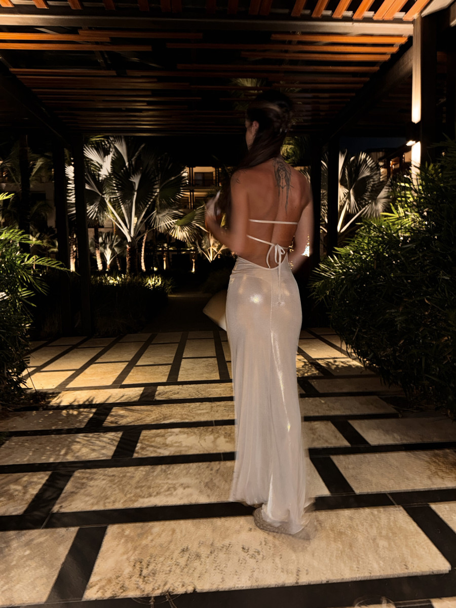 Sukienka maxi, która przyciąga spojrzenia dzięki idealnie dopasowanemu krojowi i subtelnemu połyskowi materiału. Góra w formie bandeau z efektownym wycięciem podkreśla dekolt, a długie, opływające ciało linie sukienki dodają jej lekkości i elegancji. Wiązanie na plecach nadaje całości zmysłowego charakteru, a elastyczna tkanina pięknie dopasowuje się do sylwetki. Minimalistyczna, ale pełna charakteru – sprawdzi się zarówno na eleganckie wyjścia, jak i wyjątkowe letnie wieczory.