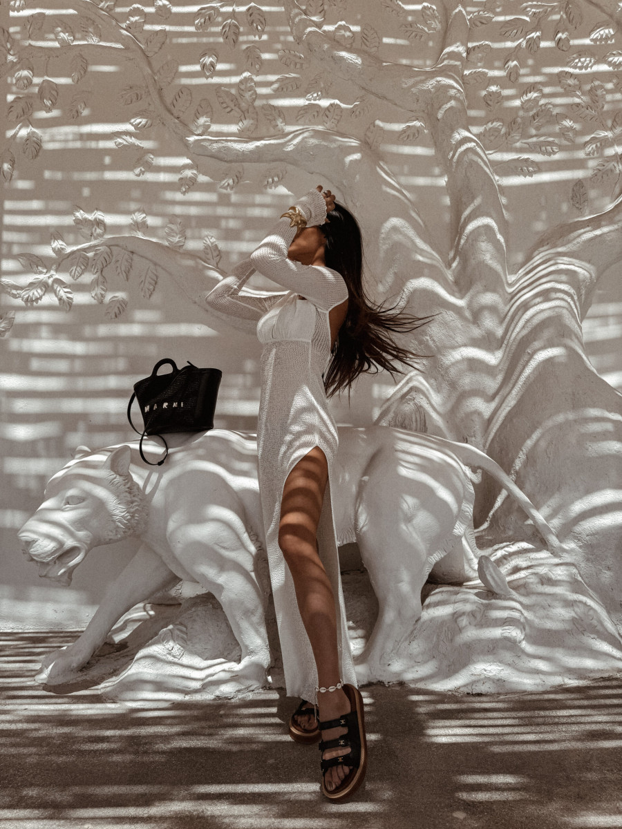 Efektowna sukienka wykonana z przewiewnej dzianiny o wyraźnym splocie, idealna na lato. Fason dopasowany w talii i lekko rozkloszowany ku dołowi, podkreślający kobiecą sylwetkę. Model posiada długie rękawy z delikatnie rozszerzanymi mankietami oraz głębokie rozcięcie na udzie, które nadaje całości lekkości i zmysłowości.