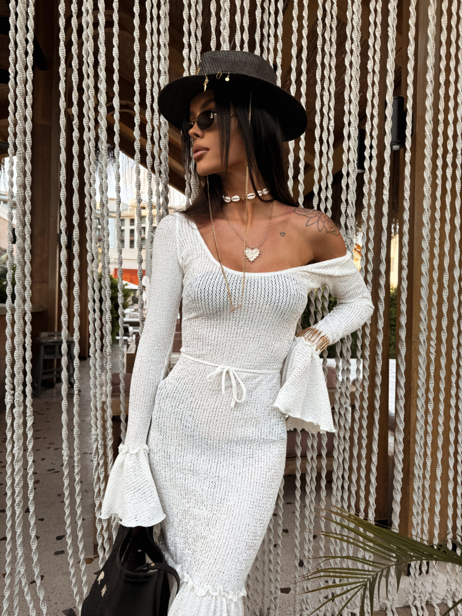Stylowa sukienka maxi wykonana z lekkiej dzianiny o delikatnym, ażurowym splocie. Fason dopasowany na górze i subtelnie rozszerzany ku dołowi, z dekoracyjnym marszczeniem i falbaną, która nadaje całości kobiecego charakteru. Model posiada długie rękawy z efektownie rozszerzanymi mankietami.