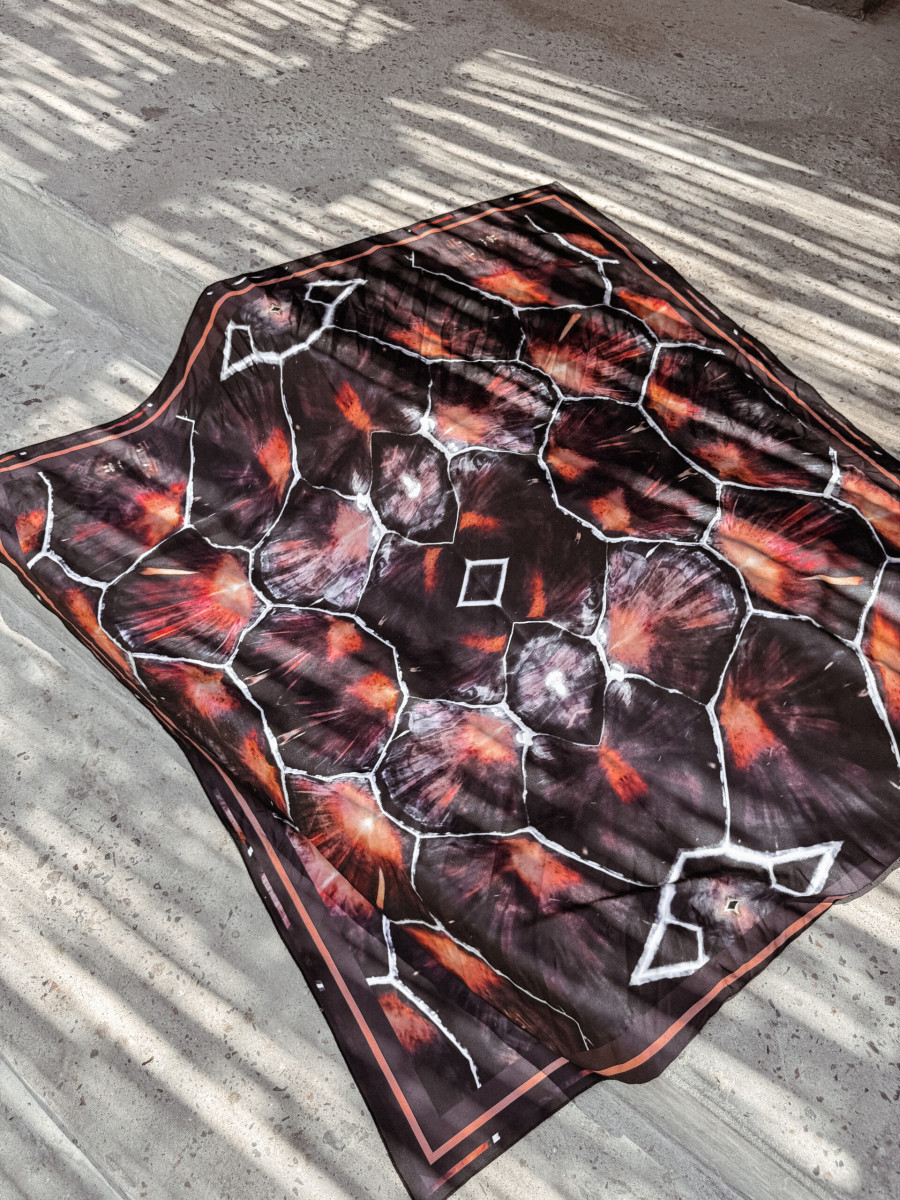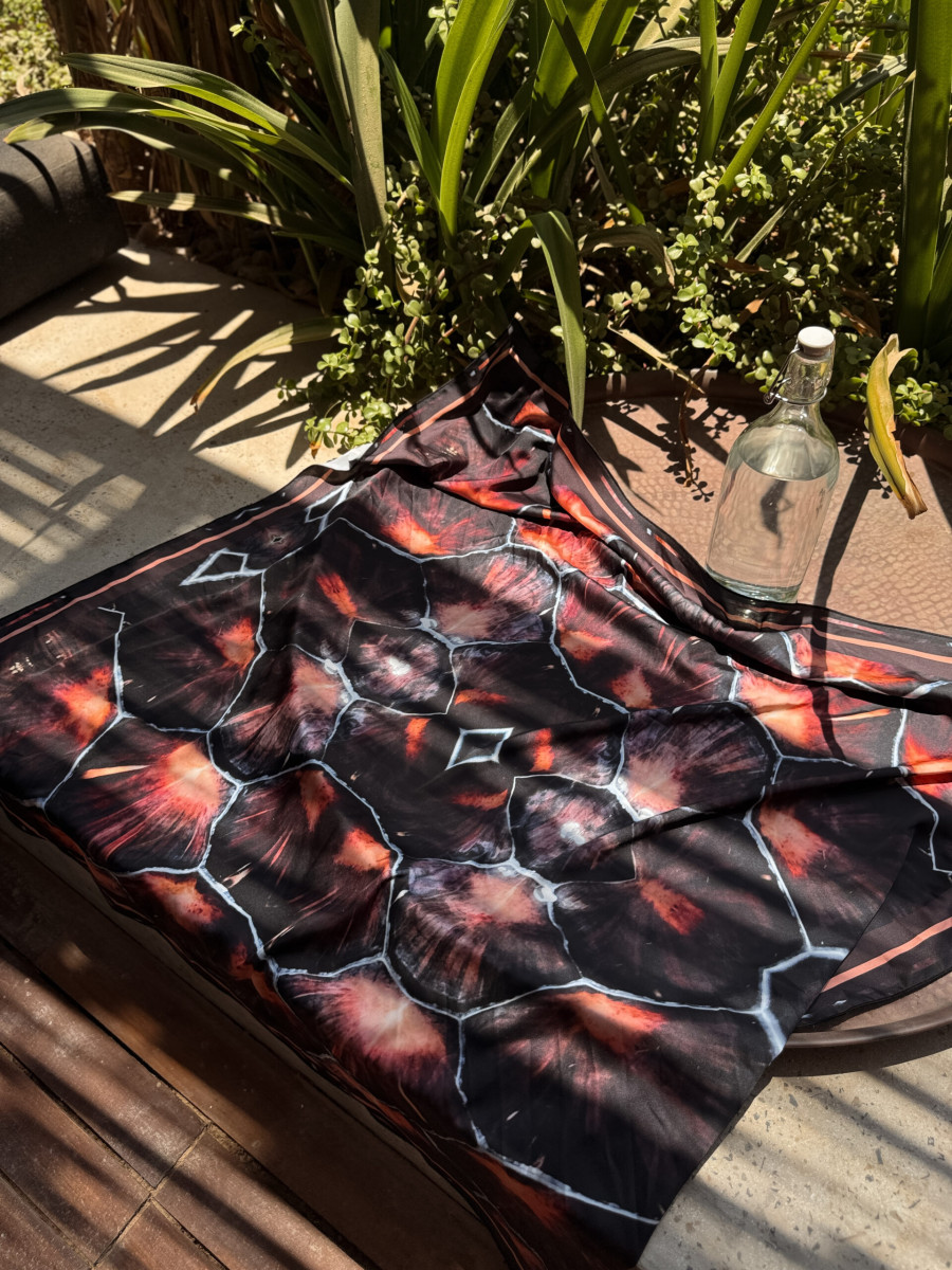 Kwadratowa chusta o wymiarach 90 × 90 cm, wykonana z lekkiego, delikatnego materiału o satynowym wykończeniu. Druk dwustronny zapewnia głębię koloru i perfekcyjny efekt wizualny z każdej perspektywy – niezależnie od sposobu noszenia.
