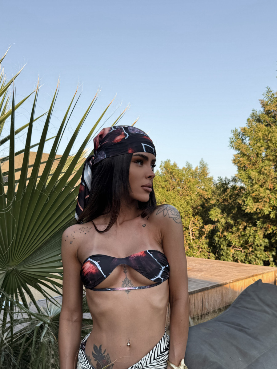 Można ją stylizować jako pareo, opaskę na głowę, top lub przewiązać na torbie – to uniwersalny dodatek, który dopełni każdą letnią stylizację. Autorskie wzory inspirowane naturą i teksturą tkanin tworzą unikalny charakter każdej chusty.
