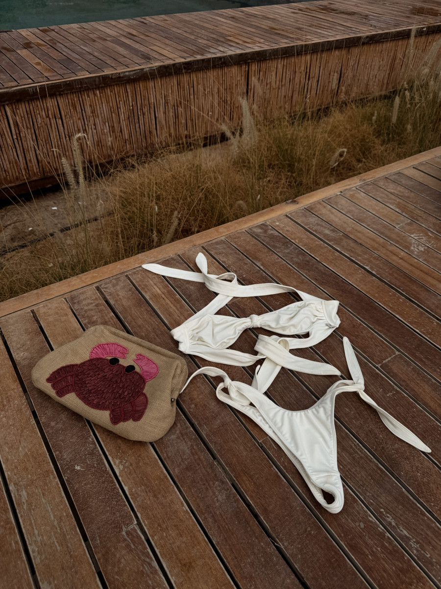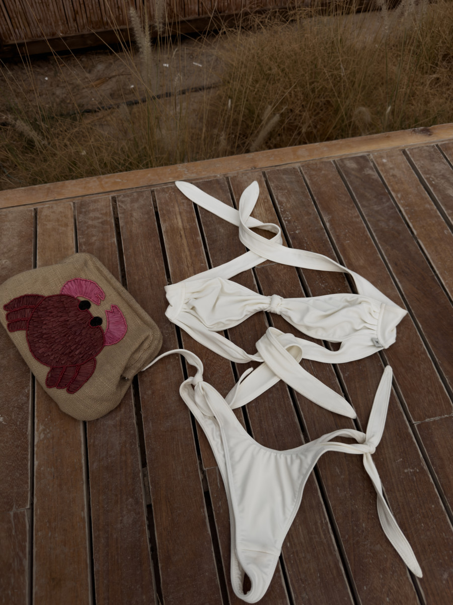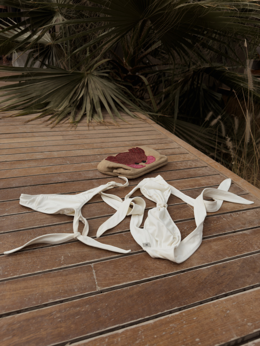 Dół bikini z wiązaniami po bokach, wycięty tak, by podkreślać biodra i optycznie wydłużać nogi. Wykonany z elastycznej, miękkiej tkaniny pięknie dopasowuje się do ciała. Klasyczna baza do wielu stylizacji – od kompletu z dopasowaną górą po niezależne zestawy z innymi elementami kolekcji.
