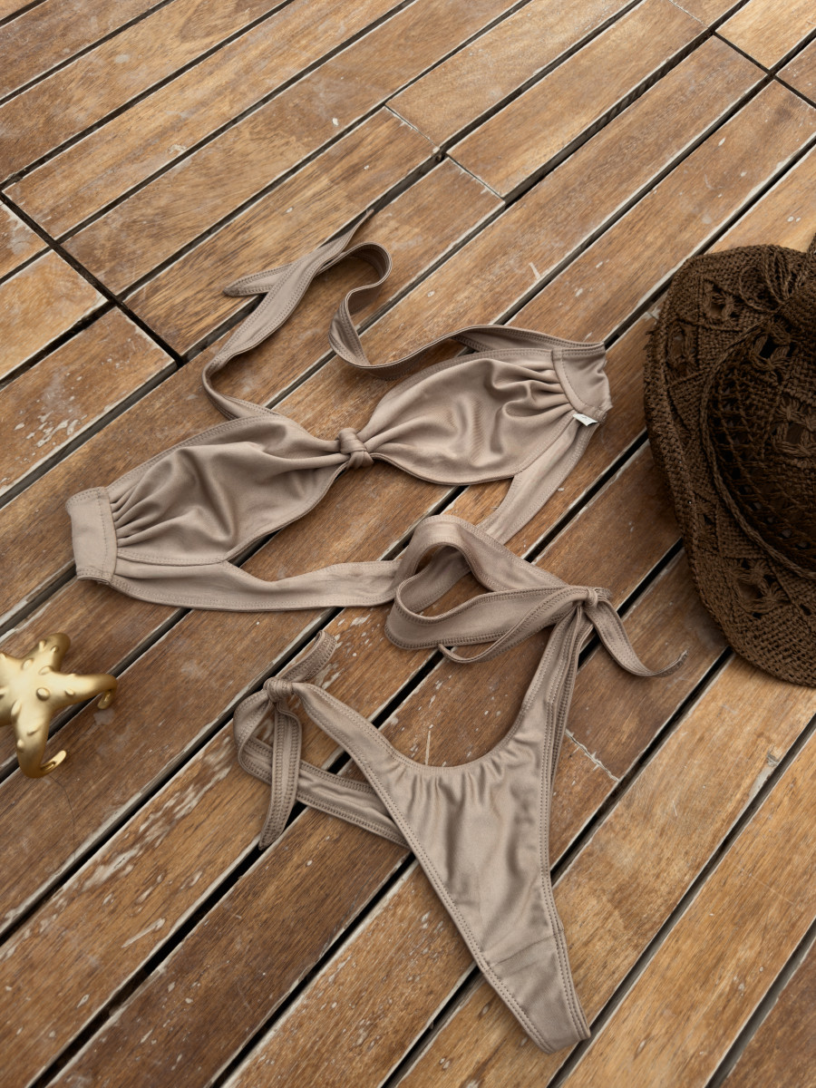 Dół bikini z wiązaniami po bokach, wycięty tak, by podkreślać biodra i optycznie wydłużać nogi. Wykonany z elastycznej, miękkiej tkaniny pięknie dopasowuje się do ciała. Klasyczna baza do wielu stylizacji – od kompletu z dopasowaną górą po niezależne zestawy z innymi elementami kolekcji.