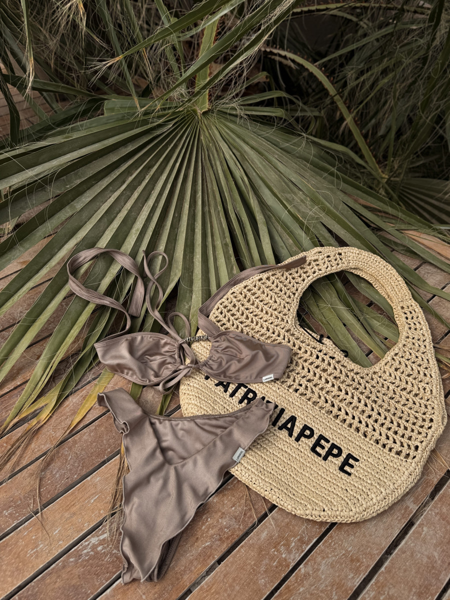 Trójkątny top z możliwością wiązania na wiele sposobów – klasycznie na szyi, skrzyżowany na dekolcie lub jako bandeau. Ruchome miseczki pozwalają regulować głębokość dekoltu, a cienkie sznurki dają pełną swobodę stylizacji. Na środku umieszczono ręcznie nawleczone ceramiczne koraliki, które dodają całości wyjątkowego charakteru i przywołują klimat rękodzielniczego luksusu. Z boku delikatna metka z logo – subtelny, ale wyrazisty detal. Model, który łączy minimalizm z artystycznym podejściem do formy. Idealny do miksowania z różnymi dołami z kolekcji.
