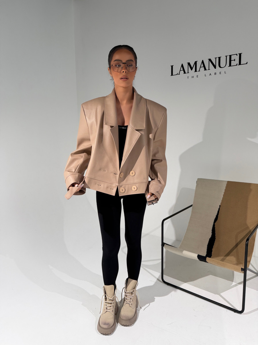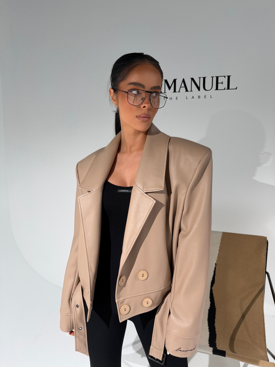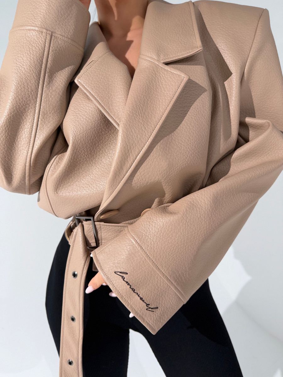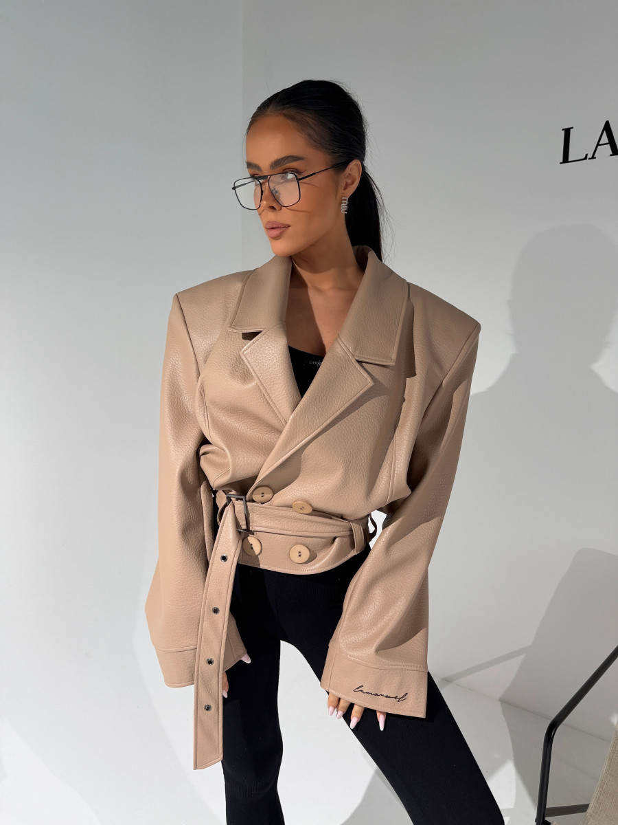 Kurtka wykonana z wysokiej jakości eko skóry o wyrazistej strukturze. Klasyczny fason z szerokimi ramionami i mocno zarysowaną linią kołnierza. Dwurzędowe zapięcie z dużymi guzikami i pasek z klamrą w talii podkreślają kobiecą sylwetkę. Stylowa, mocna forma – idealna do jeansów i codziennych looków.