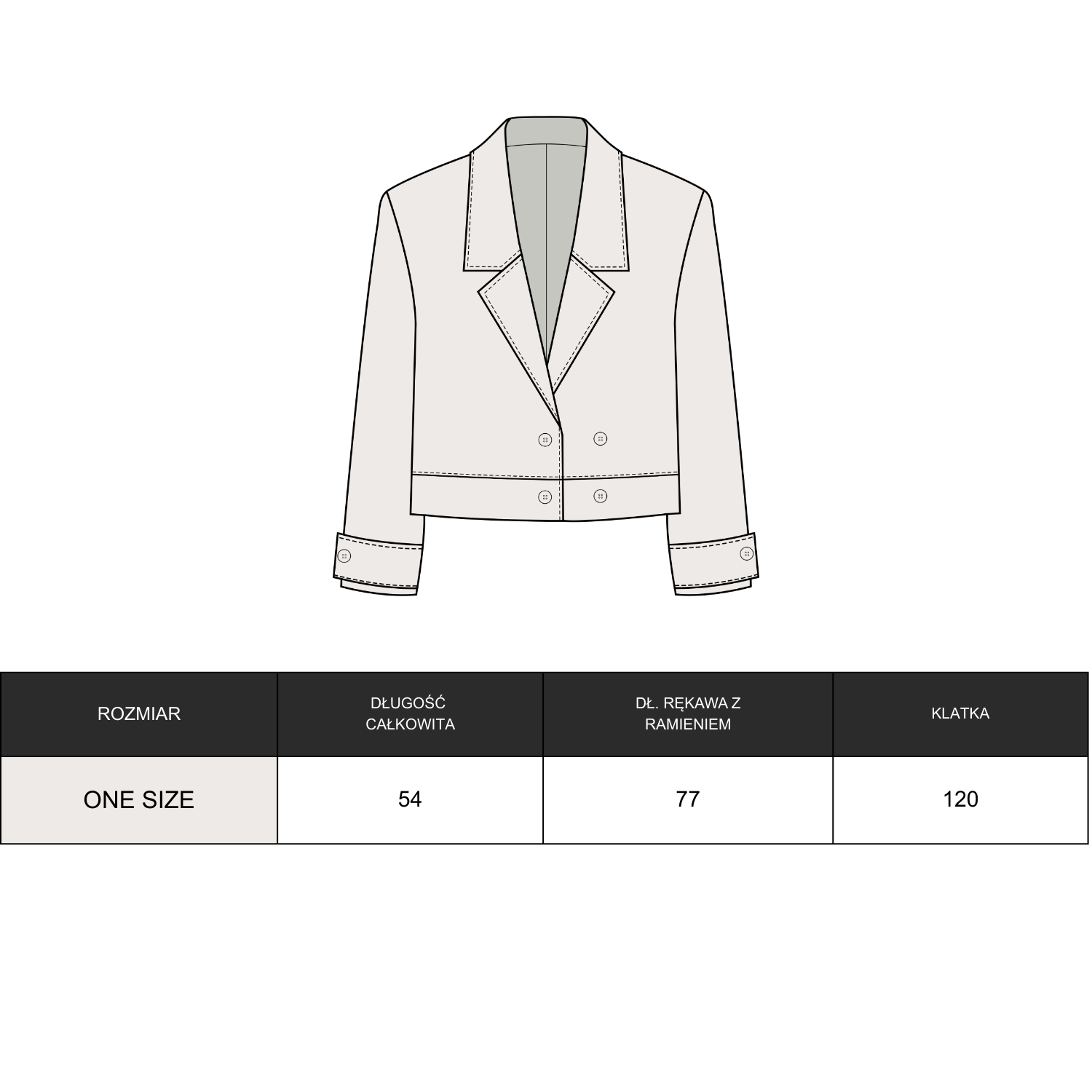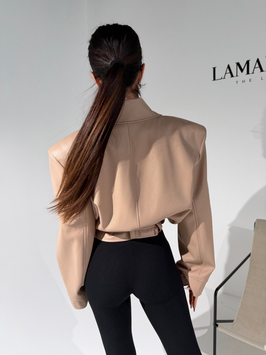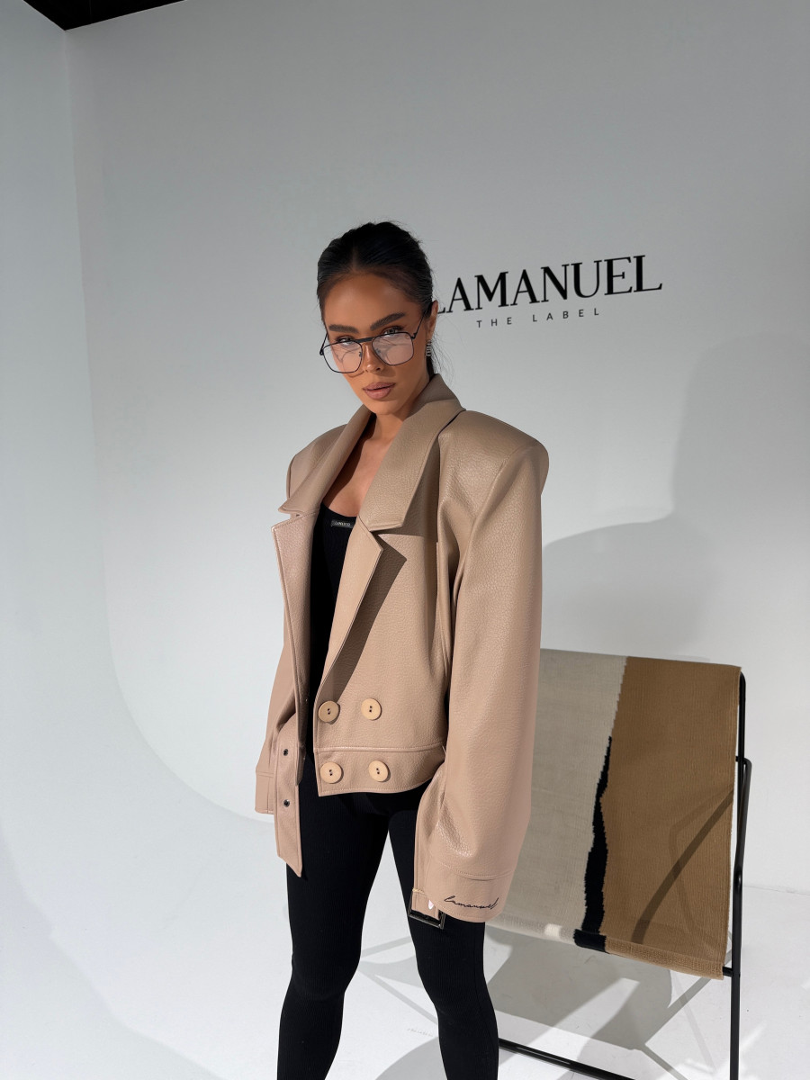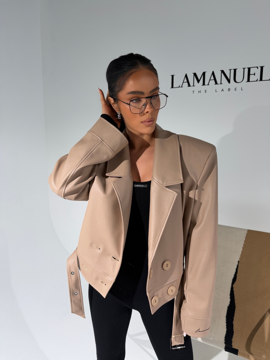 Kurtka wykonana z wysokiej jakości eko skóry o wyrazistej strukturze. Klasyczny fason z szerokimi ramionami i mocno zarysowaną linią kołnierza. Dwurzędowe zapięcie z dużymi guzikami i pasek z klamrą w talii podkreślają kobiecą sylwetkę. Stylowa, mocna forma – idealna do jeansów i codziennych looków.